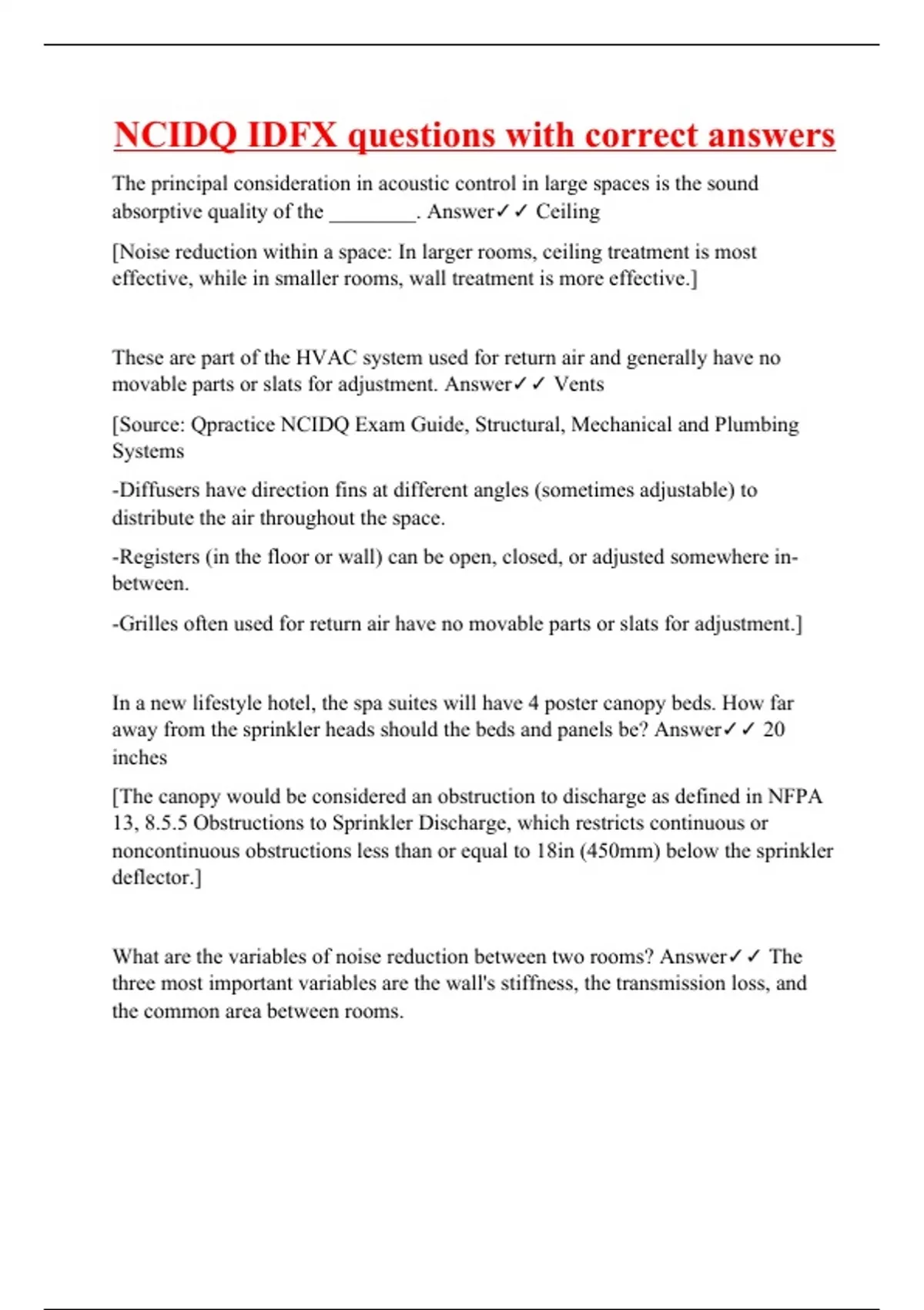 The principal consideration in acoustic control in large spaces is the sound absorptive quality of the ________. Answer Ceiling [Noise reduction within a space: In larger rooms, ceiling treatment is most effective, while in smaller rooms, wall treatment is more effective.] These are part of the HVAC system used for return air and generally have no movable parts or slats for adjustment. Answer Vents [Source: Qpractice NCIDQ Exam Guide, Structural, Mechanical and Plumbing Systems -Diffusers have direction fins at different angles (sometimes adjustable) to distribute the air throughout the space. -Registers (in the floor or wall) can be open, closed, or adjusted somewhere in-between. -Grilles often used for return air have no movable parts or slats for adjustment.] In a new lifestyle hotel, the spa suites will have 4 poster canopy beds. How far away from the sprinkler heads should the beds and panels be? Answer 20 inches [The canopy would be considered an obstruction to discharge as defined in NFPA 13, 8.5.5 Obstructions to Sprinkler Discharge, which restricts continuous or noncontinuous obstructions less than or equal to 18in (450mm) below the sprinkler deflector.] What are the variables of noise reduction between two rooms? Answer The three most important variables are the wall's stiffness, the transmission loss, and the common area between rooms.