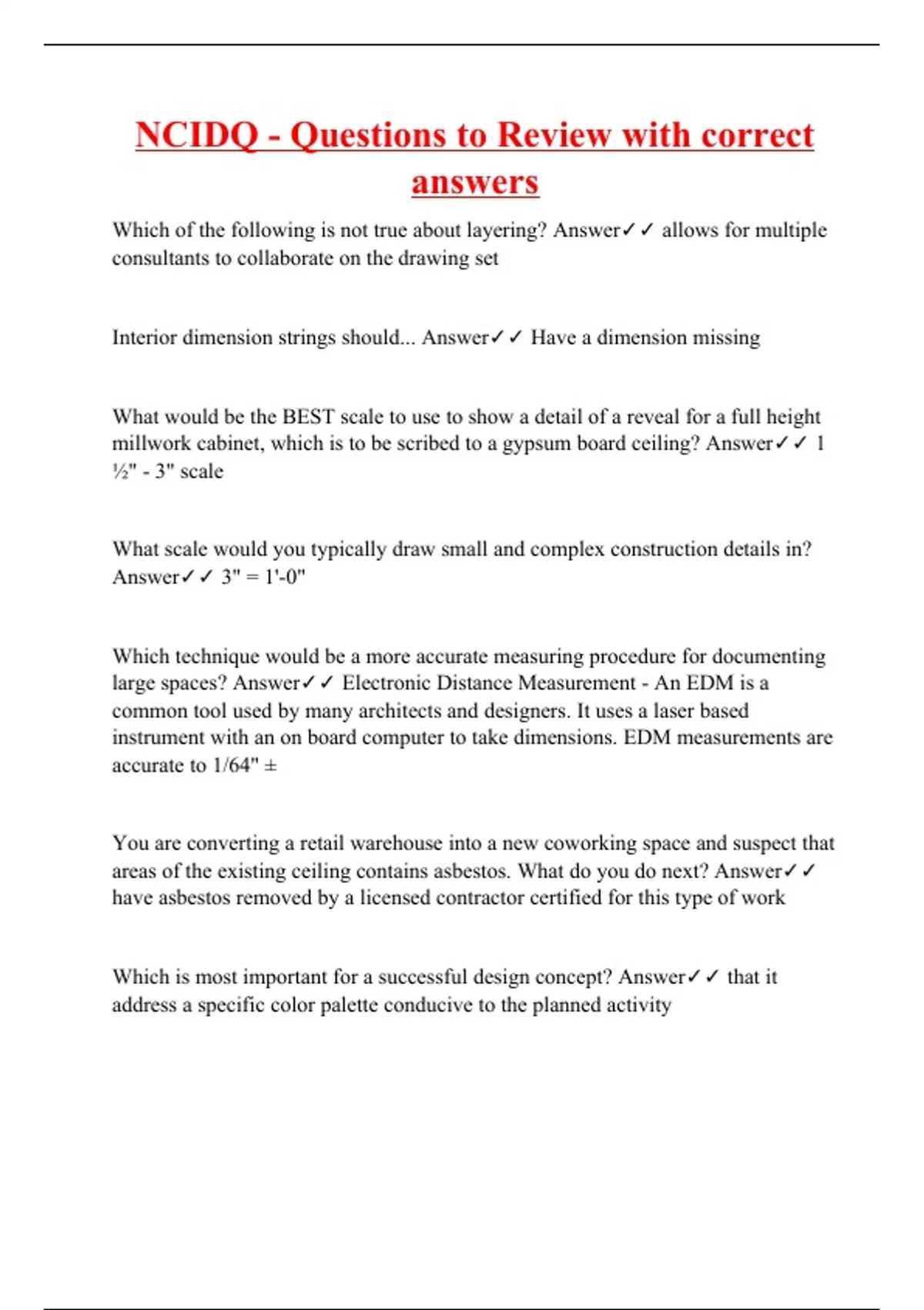 Which of the following is not true about layering? Answer allows for multiple consultants to collaborate on the drawing set Interior dimension strings should... Answer Have a dimension missing What would be the BEST scale to use to show a detail of a reveal for a full height millwork cabinet, which is to be scribed to a gypsum board ceiling? Answer 1 ½" - 3" scale What scale would you typically draw small and complex construction details in? Answer 3" = 1'-0" Which technique would be a more accurate measuring procedure for documenting large spaces? Answer Electronic Distance Measurement - An EDM is a common tool used by many architects and designers. It uses a laser based instrument with an on board computer to take dimensions. EDM measurements are accurate to 1/64" ± You are converting a retail warehouse into a new coworking space and suspect that areas of the existing ceiling contains asbestos. What do you do next? Answer have asbestos removed by a licensed contractor certified for this type of work Which is most important for a successful design concept? Answer that it address a specific color palette conducive to the planned activity