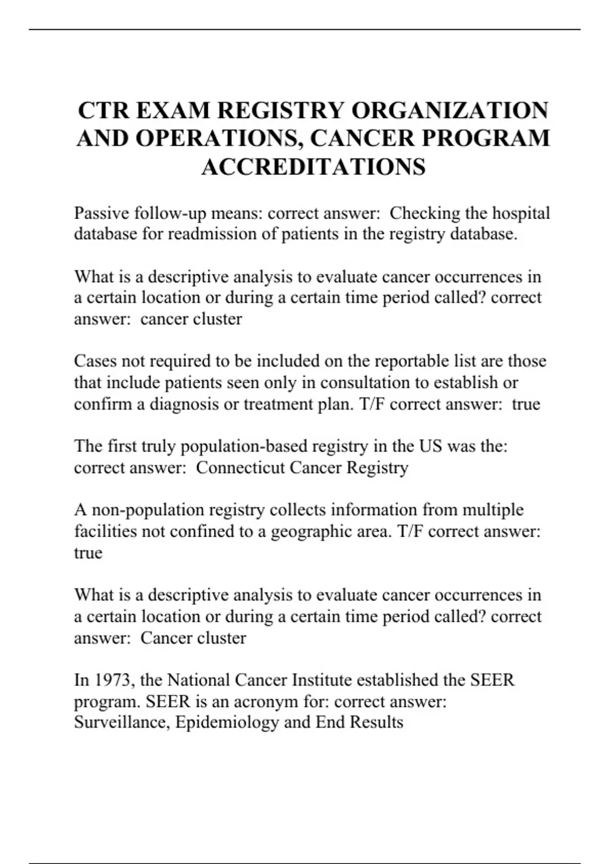Passive follow-up means: correct answer: Checking the hospital database for readmission of patients in the registry database. What is a descriptive analysis to evaluate cancer occurrences in a certain location or during a certain time period called? correct answer: cancer cluster Cases not required to be included on the reportable list are those that include patients seen only in consultation to establish or confirm a diagnosis or treatment plan. T/F correct answer: true The first truly population-based registry in the US was the: correct answer: Connecticut Cancer Registry A non-population registry collects information from multiple facilities not confined to a geographic area. T/F correct answer: true What is a descriptive analysis to evaluate cancer occurrences in a certain location or during a certain time period called? correct answer: Cancer cluster In 1973, the National Cancer Institute established the SEER program. SEER is an acronym for: correct answer: Surveillance, Epidemiology and End Results State central registries: a. provide incidence data b. population