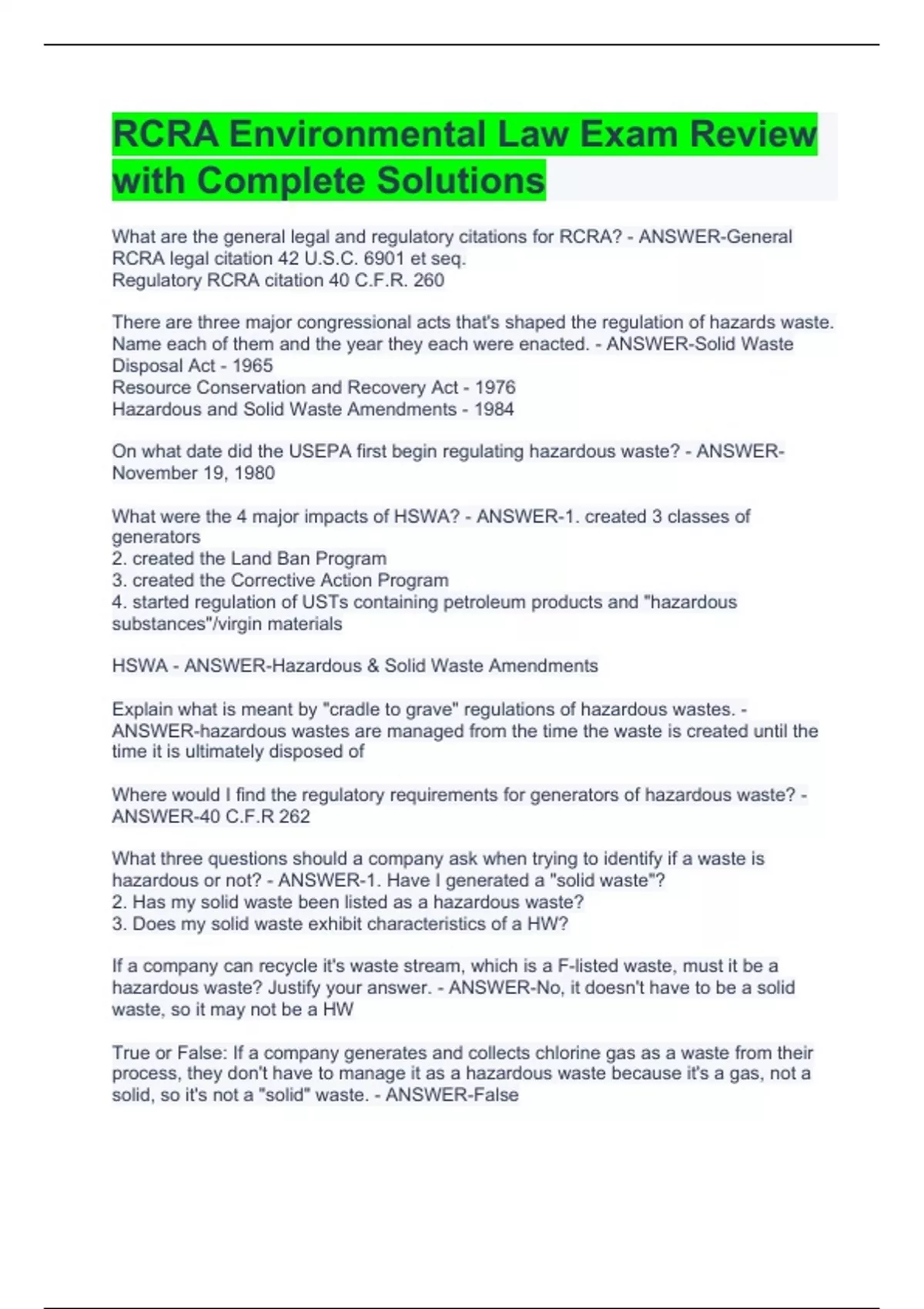 What are the general legal and regulatory citations for RCRA? - ANSWER-General RCRA legal citation 42 U.S.C. 6901 et seq. Regulatory RCRA citation 40 C.F.R. 260 There are three major congressional acts that's shaped the regulation of hazards waste. Name each of them and the year they each were enacted. - ANSWER-Solid Waste Disposal Act - 1965 Resource Conservation and Recovery Act - 1976 Hazardous and Solid Waste Amendments - 1984 On what date did the USEPA first begin regulating hazardous waste? - ANSWER-November 19, 1980 What were the 4 major impacts of HSWA? - ANSWER-1. created 3 classes of generators 2. created the Land Ban Program 3. created the Corrective Action Program 4. started regulation of USTs containing petroleum products and "hazardous substances"/virgin materials HSWA - ANSWER-Hazardous & Solid Waste Amendments Explain what is meant by "cradle to grave" regulations of hazardous wastes. - ANSWER-hazardous wastes are managed from the time the waste is created until the time it is ultimately disposed of Where would I find the regulatory requirements for generators of hazardous waste? - ANSWER-40 C.F.R 262 What three questions should a company ask when trying to identify if a waste is hazardous or not? - ANSWER-1. Have I generated a "solid waste"? 2. Has my solid waste been listed as a hazardous waste? 3. Does my solid waste exhibit characteristics of a HW? If a company can recycle it's waste stream, which is a F-listed waste, must it be a hazardous waste? Justify your answer. - ANSWER-No, it doesn't have to be a solid waste, so it may not be a HW True or False: If a company generates and collects chlorine gas as a waste from their process, they don't have to manage it as a hazardous waste because it's a gas, not a solid, so it's not a "solid" waste. - ANSWER-False