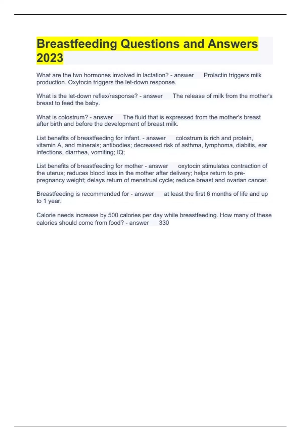 Breastfeeding Questions and Answers 2023 What are the two hormones involved in lactation? Prolactin triggers milk production. Oxytocin triggers the let-down response. What is the let-down reflex/response? The release of milk from the mother's breast to feed the baby. What is colostrum? The fluid that is expressed from the mother's breast after birth and before the development of breast milk. List benefits of breastfeeding for infant. colostrum is rich and protein, vitamin A, and minerals; antibodies; decreased risk of asthma, lymphoma, diabitis, ear infections, diarrhea, vomiting; IQ; List benefits of breastfeeding for mother oxytocin stimulates contraction of the uterus; reduces blood loss in the mother after delivery; helps return to pre-pregnancy weight; delays return of menstrual cycle; reduce breast and ovarian cancer. Breastfeeding is recommended for at least the first 6 months of life and up to 1 year. Calorie needs increase by 500 calories per day while breastfeeding. How many of these calories should come from food? 330