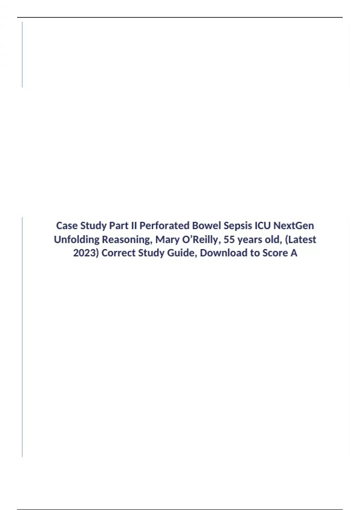 Case Study Part II Perforated Bowel Sepsis ICU NextGen Unfolding Reasoning, Mary O’Reilly, 55 years old, (Latest 2023) Correct Study Guide, Download to Score A