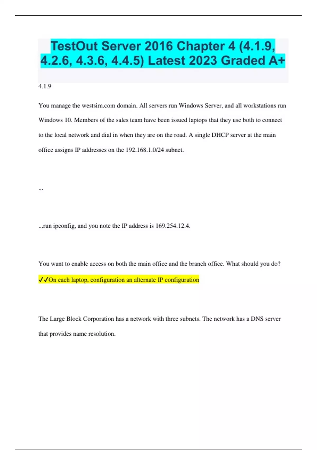 TestOut Server 2016 Chapter 4 (4.1.9, 4.2.6, 4.3.6, 4.4.5) Latest 2023 Graded A+ 4.1.9 You manage the domain. All servers run Windows Server, and all workstations run Windows 10. Members of the sales team have been issued laptops that they use both to connect to the local network and dial in when they are on the road. A single DHCP server at the main office assigns IP addresses on the 192.168.1.0/24 subnet. ... ...run ipconfig, and you note the IP address is 169.254.12.4. You want to enable access on both the main office and the branch office. What should you do? On each laptop, configuration an alternate IP configuration The Large Block Corporation has a network with three subnets. The network has a DNS server that provides name resolution. Stacy has been asked to implement a DHCP solution for her network. Currently, all hosts use manually configured static IP addresses. She installs a DHCP server and configures it to deliver IP address, default gateway, and DNS server configuration information. What must Stacy do at each client to complete the configuration? (Select two.) Configure each host to obtain DNS server address automatically Configure each host to obtain an IP address automatically You have a single router with three subnets as follows: - SubnetA = 50 hosts - SubnetB = 15 hosts - SubnetC = 65 hosts Which mask values should you use? SubnetA = 255.255.255.192 SubnetB = 255.255.255.224 SubnetC = 255.255.255.128 26 bits = 62 hosts 27 bits = 30 hosts 25 bits = 128 hosts You need to design a network that supports 275 hosts. You want to place all hosts in a single broadcast domain, and want to make sure you do not waste IP addresses. How should you implement your plan? Place all hosts on the same subnet. Use a mask of 255.255.254.0 You have a single router with three subnets as follows: - SubnetA = 60 hosts - SubnetB = 25 hosts - SubnetC = 31 hosts Which