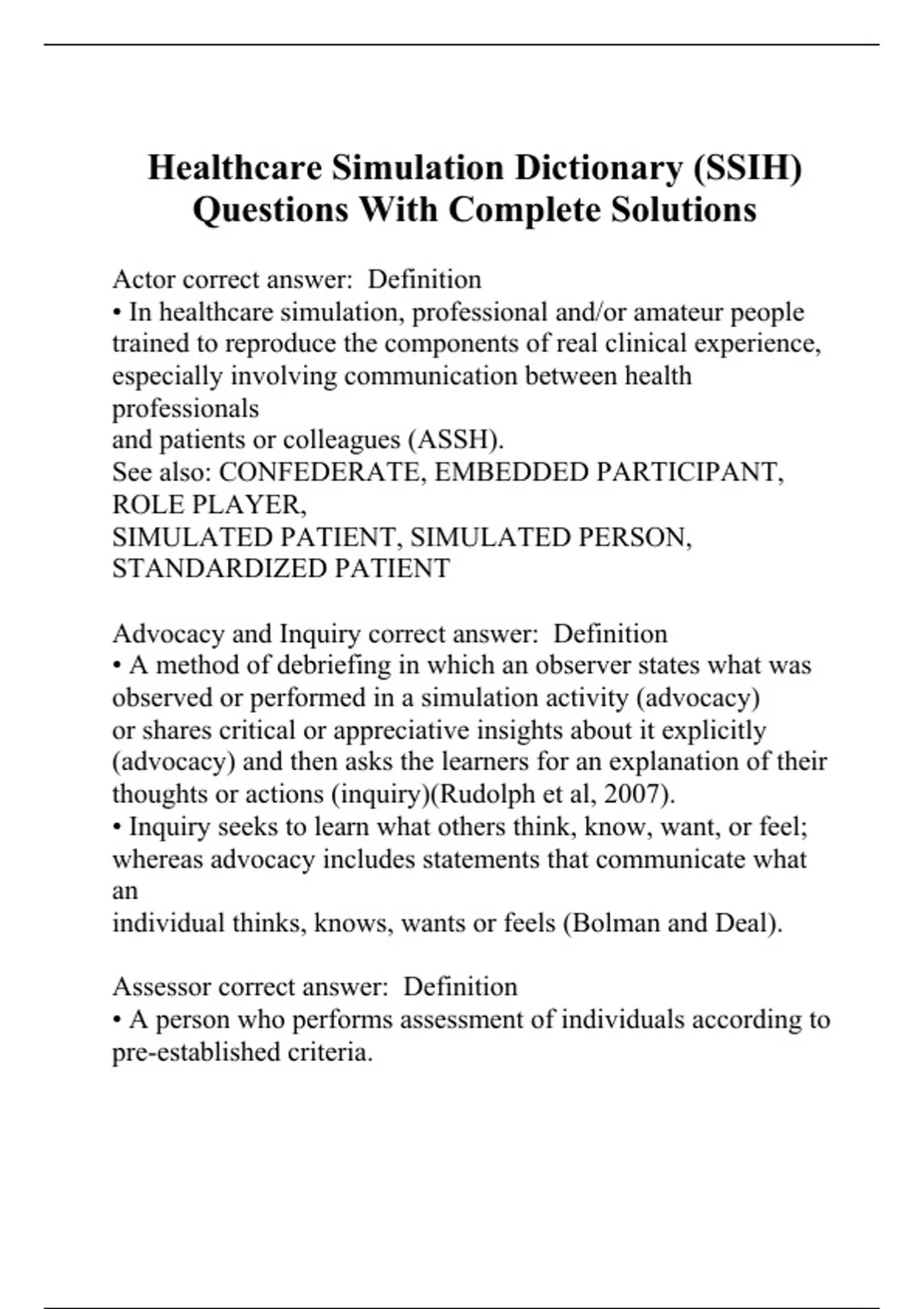 Actor correct answer: Definition • In healthcare simulation, professional and/or amateur people trained to reproduce the components of real clinical experience, especially involving communication between health professionals and patients or colleagues (ASSH). See also: CONFEDERATE, EMBEDDED PARTICIPANT, ROLE PLAYER, SIMULATED PATIENT, SIMULATED PERSON, STANDARDIZED PATIENT Advocacy and Inquiry correct answer: Definition • A method of debriefing in which an observer states what was observed or performed in a simulation activity (advocacy) or shares critical or appreciative insights about it explicitly (advocacy) and then asks the learners for an explanation of their thoughts or actions (inquiry)(Rudolph et al, 2007). • Inquiry seeks to learn what others think, know, want, or feel; whereas advocacy includes statements that communicate what an individual thinks, knows, wants or feels (Bolman and Deal). Assessor correct answer: Definition • A person who performs assessment of individuals according to pre-established criteria. • Assessors must have specific and substantial training, expertise, and competency in assessment (D).