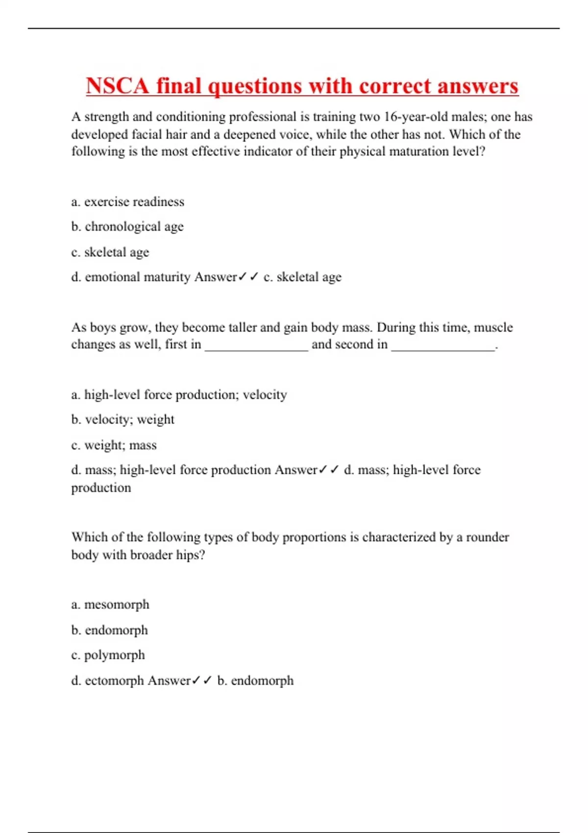 A strength and conditioning professional is training two 16-year-old males; one has developed facial hair and a deepened voice, while the other has not. Which of the following is the most effective indicator of their physical maturation level? a. exercise readiness b. chronological age c. skeletal age d. emotional maturity Answer c. skeletal age As boys grow, they become taller and gain body mass. During this time, muscle changes as well, first in _______________ and second in _______________. a. high-level force production; velocity b. velocity; weight c. weight; mass d. mass; high-level force production Answer d. mass; high-level force production Which of the following types of body proportions is characterized by a rounder body with broader hips? a. mesomorph b. endomorph c. polymorph d. ectomorph Answer b. endomorph