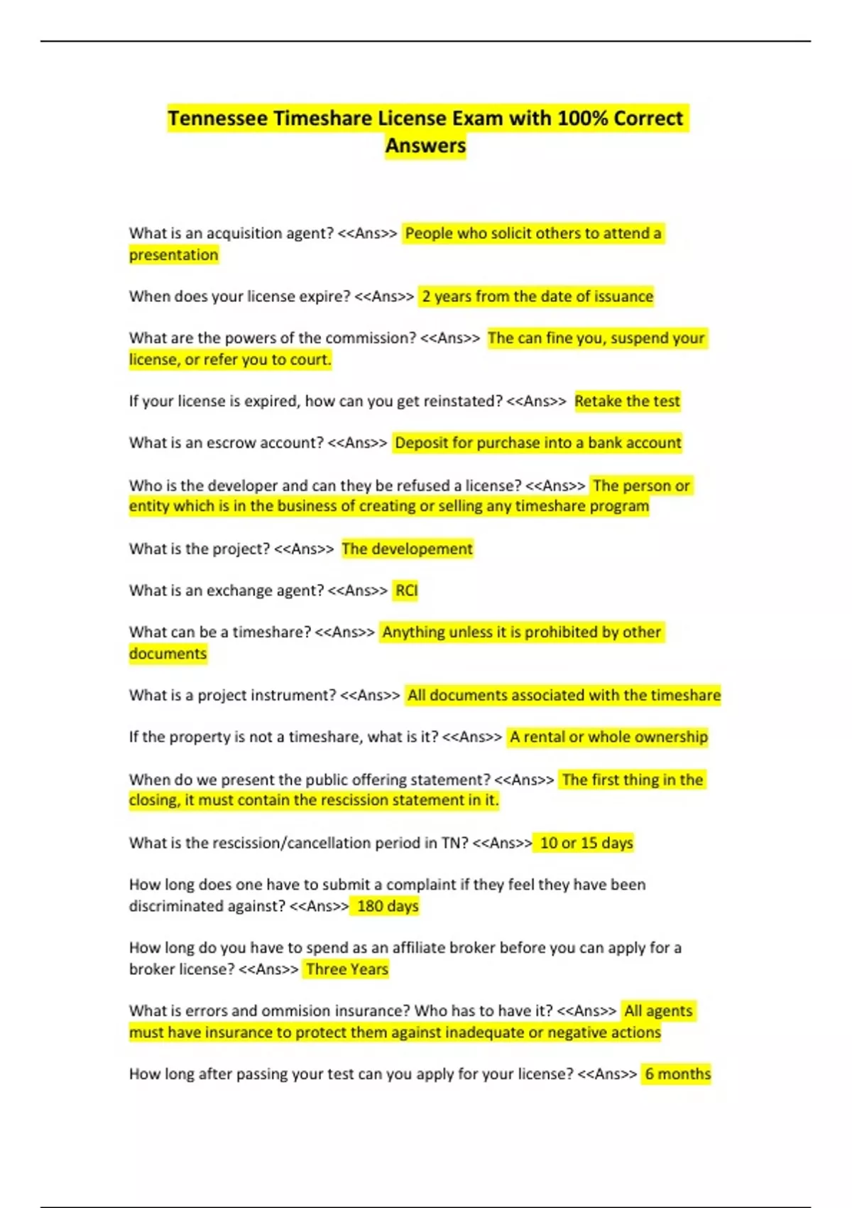 What is an acquisition agent? <<Ans>> People who solicit others to attend a presentation When does your license expire? <<Ans>> 2 years from the date of issuance What are the powers of the commission? <<Ans>> The can fine you, suspend your license, or refer you to court. If your license is expired, how can you get reinstated? <<Ans>> Retake the test What is an escrow account? <<Ans>> Deposit for purchase into a bank account Who is the developer and can they be refused a license? <<Ans>> The person or entity which is in the business of creating or selling any timeshare program What is the project? <<Ans>> The developement What is an exchange agent? <<Ans>> RCI What can be a timeshare? <<Ans>> Anything unless it is prohibited by other documents What is a project instrument? <<Ans>> All documents associated with the timeshare If the property is not a timeshare, what is it? <<Ans>> A rental or whole ownership When do we present the public offering statement? <<Ans>> The first thing in the closing, it must contain the rescission statement in it. What is the rescission/cancellation period in TN? <<Ans>> 10 or 15 days How long does one have to submit a complaint if they feel they have been discriminated against? <<Ans>> 180 days How long do you have to spend as an affiliate broker before you can apply for a broker license? <<Ans>> Three Years What is errors and ommision insurance? Who has to have it? <<Ans>> All agents must have insurance to protect them against inadequate or negative actions How long after passing your test can you apply for your license? <<Ans>> 6 months Who is responsible to renew your license? <<Ans>> I am What does not have to be in the Truth and Lending Statement? <<Ans>> Property Value In advertising, what does misleading mean? <<Ans>> Any statement action or laim which is untrue What can you do if a guest does not have their gifts after 72 hours?? <<Ans>> Give them the gifts or the cash equivalent What can be guaranteed to a purchaser? <<Ans>> Anything in writing What are multiple owners called? <<Ans>> Tenants in common When may TREC request access to your office records? <<Ans>> Anytime during business hours