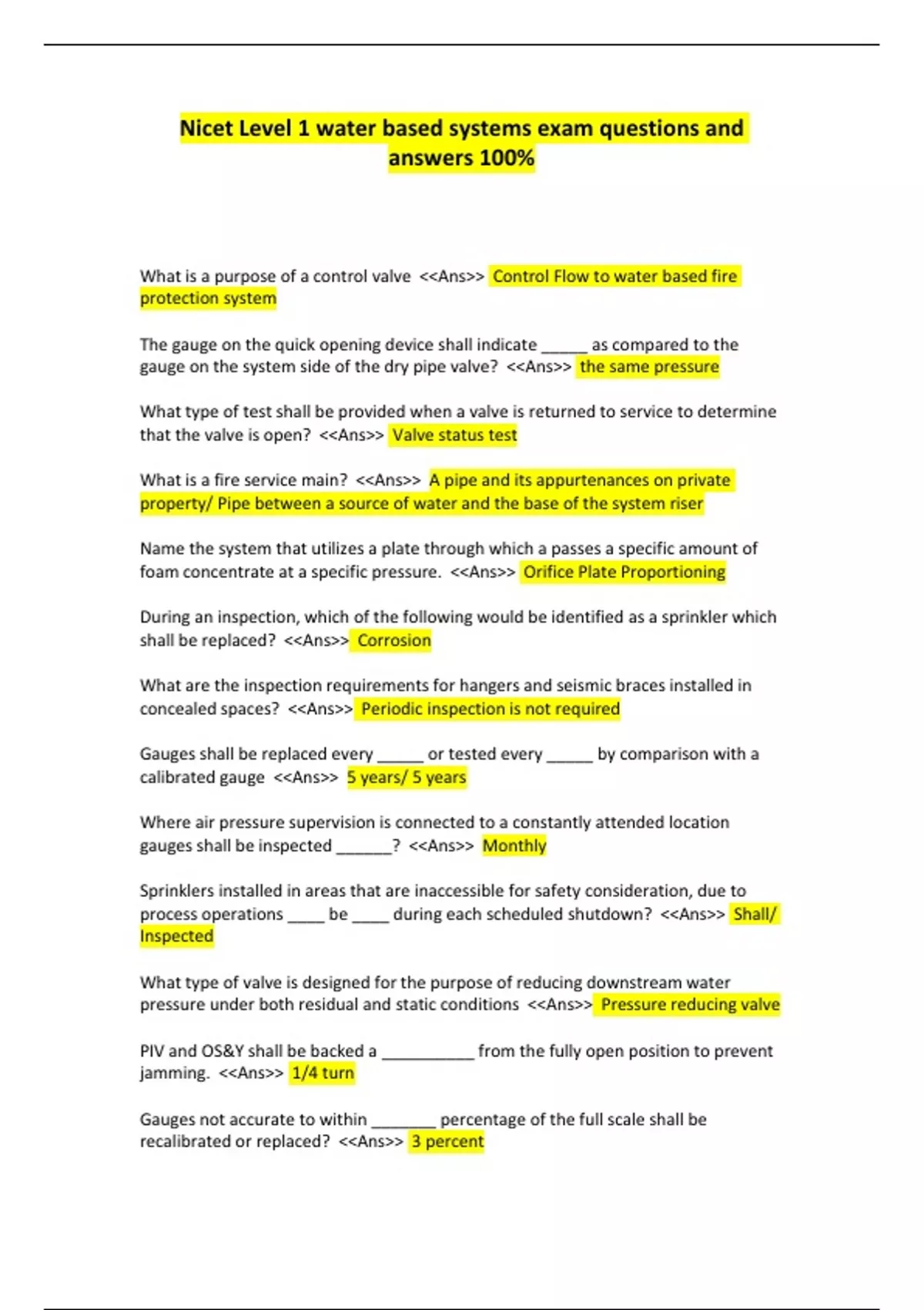 What is a purpose of a control valve <<Ans>> Control Flow to water based fire protection system The gauge on the quick opening device shall indicate _____ as compared to the gauge on the system side of the dry pipe valve? <<Ans>> the same pressure What type of test shall be provided when a valve is returned to service to determine that the valve is open? <<Ans>> Valve status test What is a fire service main? <<Ans>> A pipe and its appurtenances on private property/ Pipe between a source of water and the base of the system riser Name the system that utilizes a plate through which a passes a specific amount of foam concentrate at a specific pressure. <<Ans>> Orifice Plate Proportioning During an inspection, which of the following would be identified as a sprinkler which shall be replaced? <<Ans>> Corrosion What are the inspection requirements for hangers and seismic braces installed in concealed spaces? <<Ans>> Periodic inspection is not required Gauges shall be replaced every _____ or tested every _____ by comparison with a calibrated gauge <<Ans>> 5 years/ 5 years Where air pressure supervision is connected to a constantly attended location gauges shall be inspected ______? <<Ans>> Monthly Sprinklers installed in areas that are inaccessible for safety consideration, due to process operations ____ be ____ during each scheduled shutdown? <<Ans>> Shall/ Inspected What type of valve is designed for the purpose of reducing downstream water pressure under both residual and static conditions <<Ans>> Pressure reducing valve PIV and OS&Y shall be backed a __________ from the fully open position to prevent jamming. <<Ans>> 1/4 turn Gauges not accurate to within _______ percentage of the full scale shall be recalibrated or replaced? <<Ans>> 3 percent