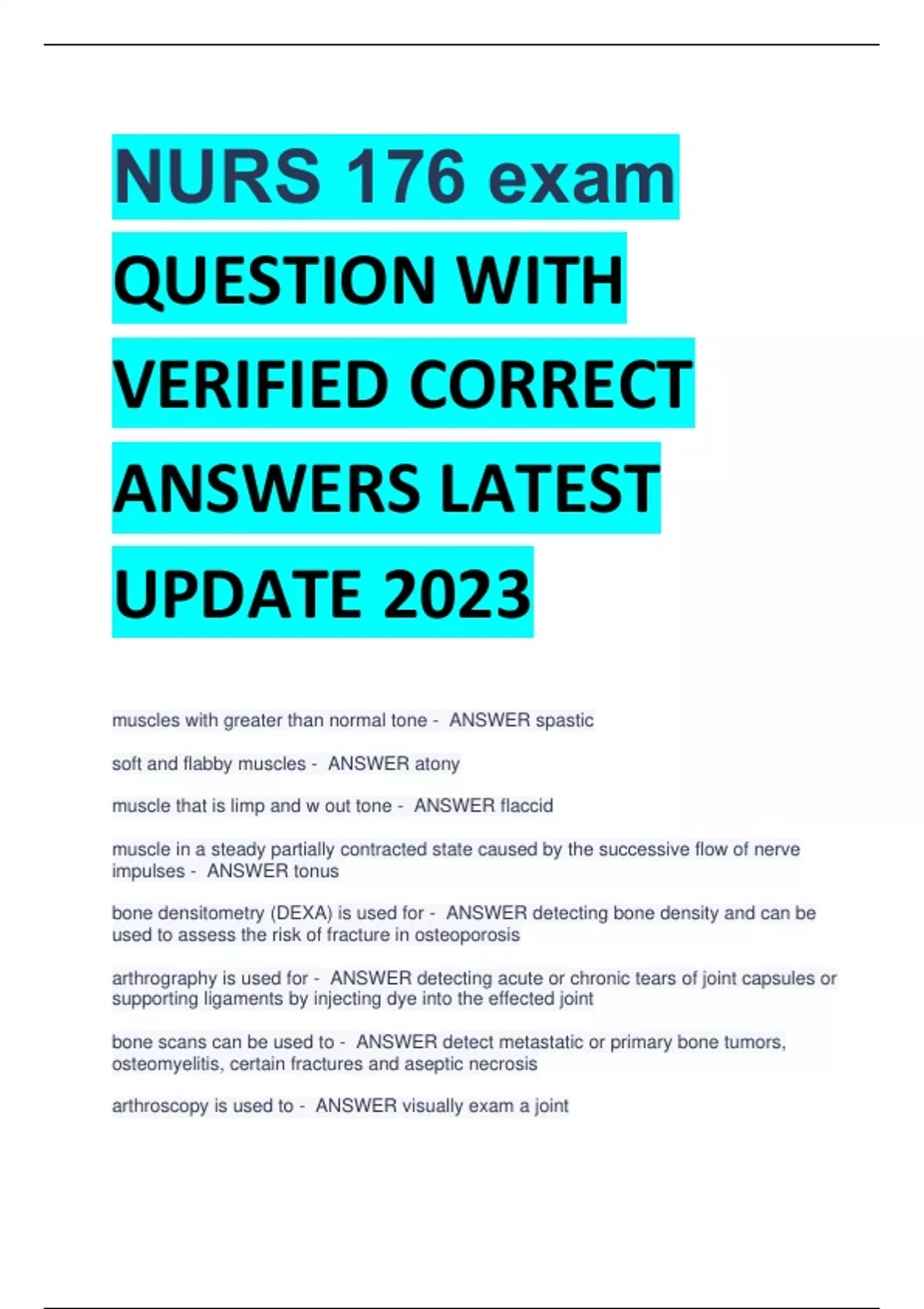 NURS 176 exam QUESTION WITH VERIFIED CORRECT ANSWERS LATEST UPDATE 2023 muscles with greater than normal tone - ANSWER spastic soft and flabby muscles - ANSWER atony muscle that is limp and w out tone - ANSWER flaccid muscle in a steady partially contracted state caused by the successive flow of nerve impulses - ANSWER tonus bone densitometry (DEXA) is used for - ANSWER detecting bone density and can be used to assess the risk of fracture in osteoporosis arthrography is used for - ANSWER detecting acute or chronic tears of joint capsules or supporting ligaments by injecting dye into the effected joint bone scans can be used to - ANSWER detect metastatic or primary bone tumors, osteomyelitis, certain fractures and aseptic necrosis arthroscopy is used to - ANSWER visually exam a joint Crepitus - ANSWER A grating or grinding sensation caused by irregular joints surfaces move across one another, as an arthritic condition Fasciculations are - ANSWER involuntary twitching of muscle fiber groups Clonus - ANSWER rhythmic contractions of a muscle