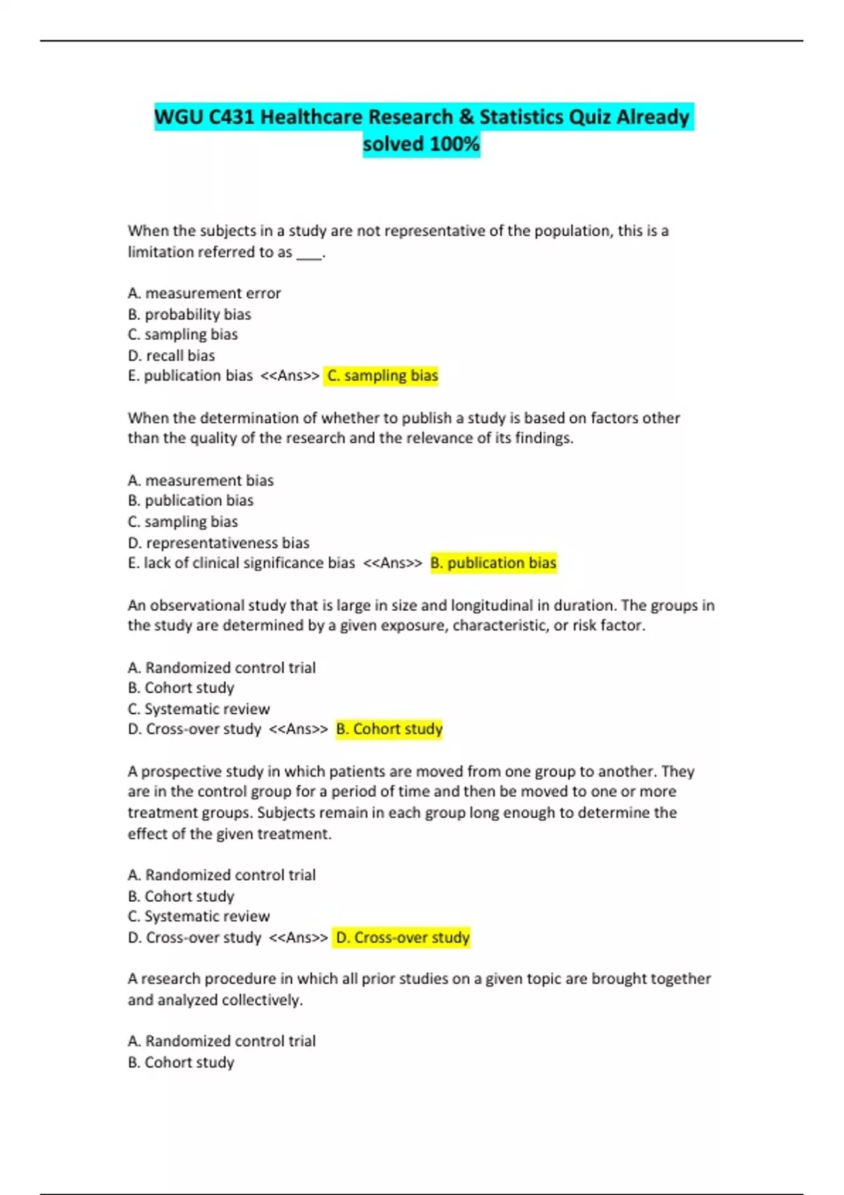 WGU C431 Healthcare Research & Statistics Quiz Already solved 100%