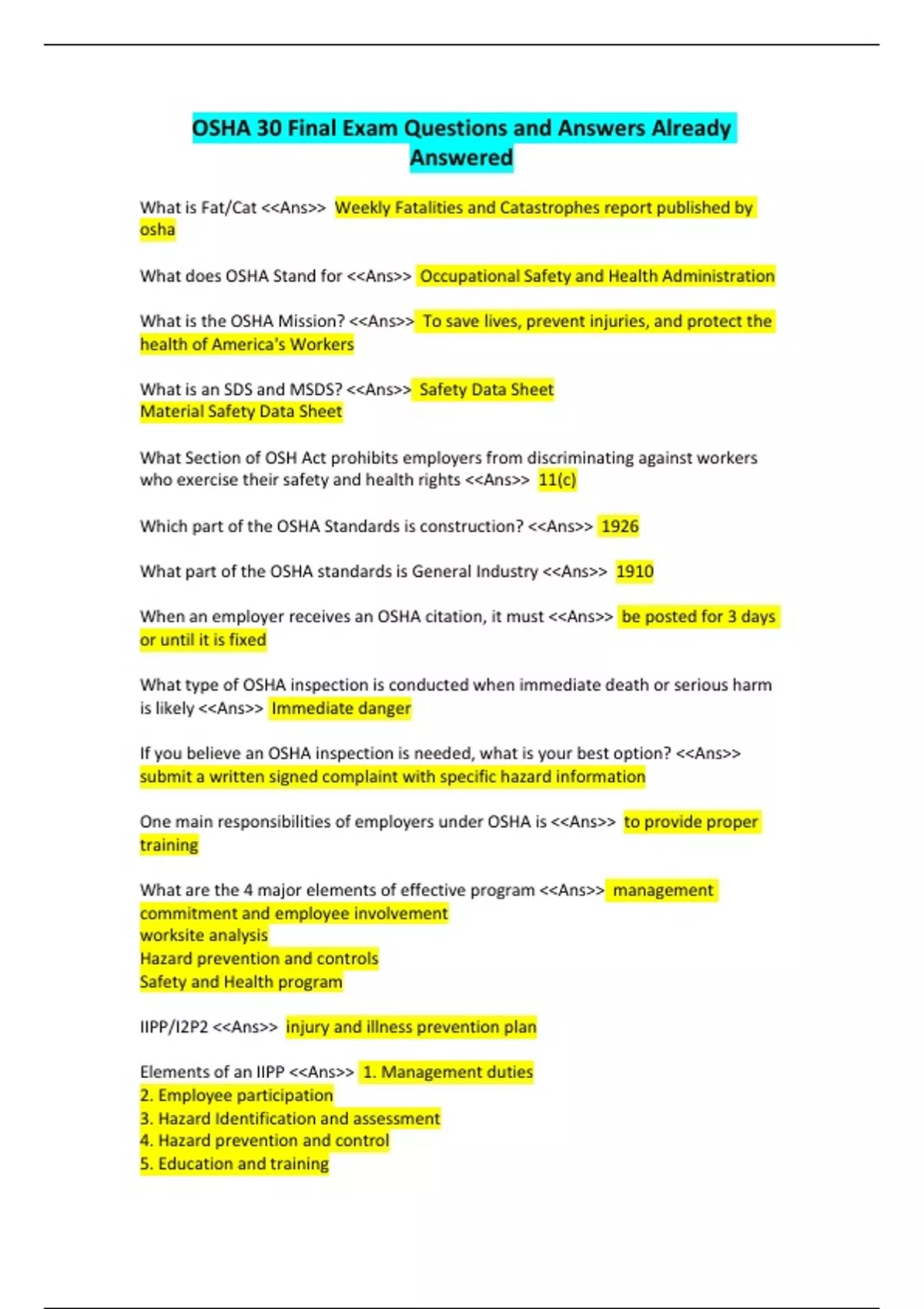 What is Fat/Cat <<Ans>> Weekly Fatalities and Catastrophes report published by osha What does OSHA Stand for <<Ans>> Occupational Safety and Health Administration What is the OSHA Mission? <<Ans>> To save lives, prevent injuries, and protect the health of America's Workers What is an SDS and MSDS? <<Ans>> Safety Data Sheet Material Safety Data Sheet What Section of OSH Act prohibits employers from discriminating against workers who exercise their safety and health rights <<Ans>> 11(c) Which part of the OSHA Standards is construction? <<Ans>> 1926 What part of the OSHA standards is General Industry <<Ans>> 1910 When an employer receives an OSHA citation, it must <<Ans>> be posted for 3 days or until it is fixed What type of OSHA inspection is conducted when immediate death or serious harm is likely <<Ans>> Immediate danger If you believe an OSHA inspection is needed, what is your best option? <<Ans>> submit a written signed complaint with specific hazard information One main responsibilities of employers under OSHA is <<Ans>> to provide proper training What are the 4 major elements of effective program <<Ans>> management commitment and employee involvement worksite analysis Hazard prevention and controls Safety and Health program IIPP/I2P2 <<Ans>> injury and illness prevention plan Elements of an IIPP <<Ans>> 1. Management duties 2. Employee participation 3. Hazard Identification and assessment 4. Hazard prevention and control 5. Education and training 6. Program evaluation How many states have IIPP requirements <<Ans>> 15 Suggestions for best IIPP <<Ans>> Be in writing Be reviewed and updated periodically Elements of IIPP <<Ans>> Responsible persons employee compliance employee communications hazard assessment Injury & Illness Investigation Hazard Control Training and Instruction Hierarchy of hazard controls <<Ans>> Elimination engineering controls administrative controls ppe Inspection records should be maintained for <<Ans>> one year at least Osha 6 questions for accidents <<Ans>> who what where when why how? what is an accident <<Ans>> unplanned, undesired event that causes damage to person, property, or environment Direct costs of accident <<Ans>> medical bills property damage costs indirect costs <<Ans>> lost time lost productivity hardship to family 3-10x greater than direct Who is responsible that investigation of accident is conducted? <<Ans>> superintendent Objective of accident investigation <<Ans>> identification of causal factors Can accidents always be prevented? <<Ans>> Yes Rules on accident interview <<Ans>> conduct in private don't assign blame initiate asap get the facts not the emotion