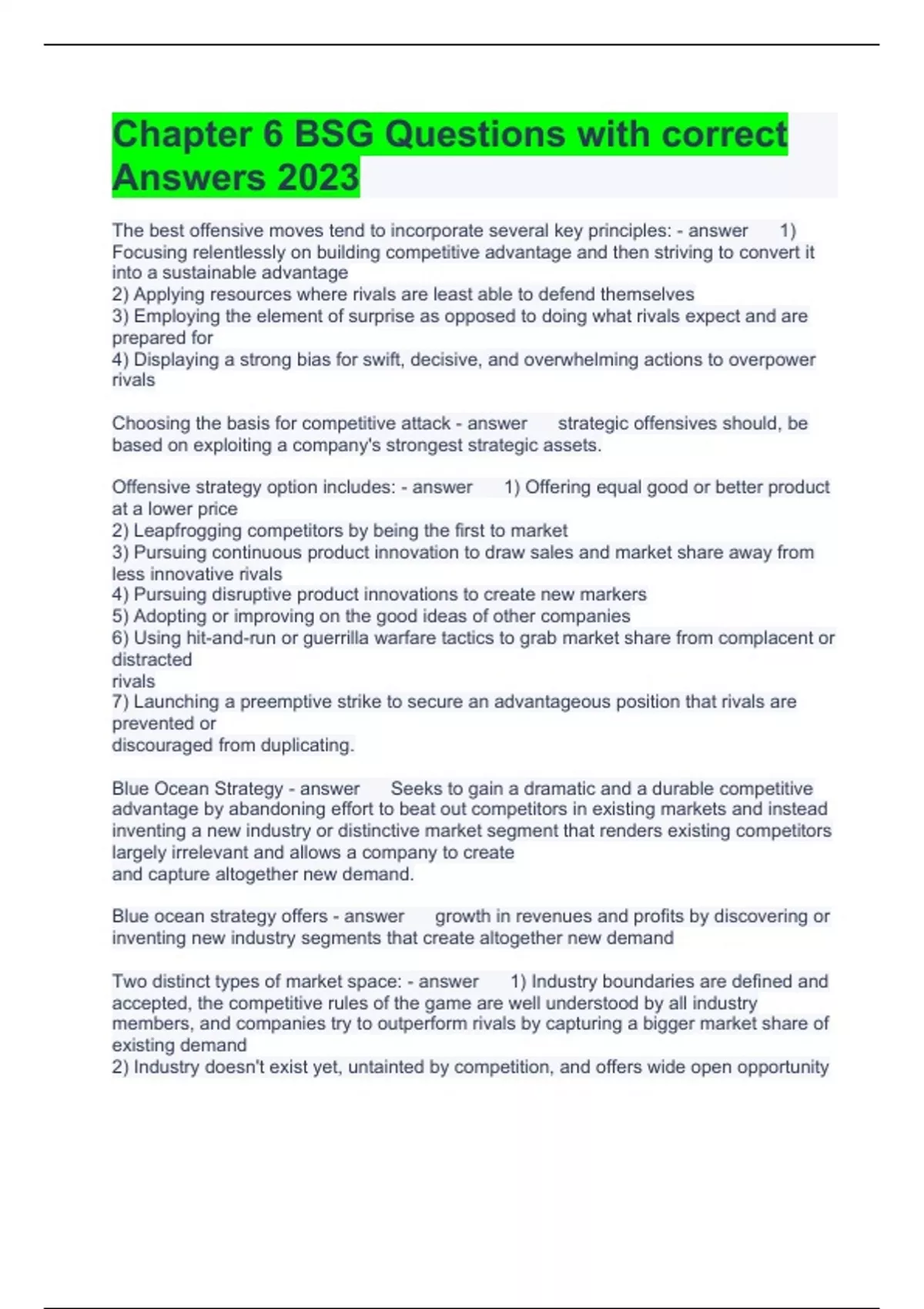 Chapter 6 BSG Questions with correct Answers 2023 The best offensive moves tend to incorporate several key principles: 1) Focusing relentlessly on building competitive advantage and then striving to convert it into a sustainable advantage 2) Applying resources where rivals are least able to defend themselves 3) Employing the element of surprise as opposed to doing what rivals expect and are prepared for 4) Displaying a strong bias for swift, decisive, and overwhelming actions to overpower rivals Choosing the basis for competitive attack strategic offensives should, be based on exploiting a company's strongest strategic assets. Offensive strategy option includes: 1) Offering equal good or better product at a lower price 2) Leapfrogging competitors by being the first to market 3) Pursuing continuous product innovation to draw sales and market share away from less innovative rivals 4) Pursuing disruptive product innovations to create new markers 5) Adopting or improving on the good ideas of other companies 6) Using hit-and-run or guerrilla warfare tactics to grab market share from complacent or distracted rivals 7) Launching a preemptive strike to secure an advantageous position that rivals are prevented or discouraged from duplicating. Blue Ocean Strategy Seeks to gain a dramatic and a durable competitive advantage by abandoning effort to beat out competitors in existing markets and instead inventing a new industry or distinctive market segment that renders existing competitors largely irrelevant and allows a company to create and capture altogether new demand. Blue ocean strategy offers growth in revenues and profits by discovering or inventing new industry segments that create altogether new demand Two distinct types of market space: 1) Industry boundaries are defined and accepted, the competitive rules of the game are well understood by all industry members, and companies try to outperform rivals by capturing a bigger market share of existing demand 2) Industry doesn't exist yet, untainted by competition, and offers wide open opportunity for profitable and rapid growth if a company can come up with a product offering and strategy that allows it to create new demand rather than fight over existing demand Defensive strategies counter offensive strategies by: 1) Lowering the risk of being attacked 2) Weakening the impact of any attacks that occurs 3) Influencing challengers to aim their attacks at other rivals Because of first-mover advantages & disadvantages competitive advantage can spring from when a move is made as well as from what move is made 5 conditions first-movers have an advantage: 1) When pioneering helps build a firm's reputation with buyers and creates brand loyalty 2) When a first mover's customers will thereafter face significant switching costs 3) When property rights protections thwart rapid imitation of the initial move. 4) When an early lead enables the first mover to move down the learning curve ahead of rivals 5) When a first mover can set the technical standard for the industry Potential late-mover advantages 1) When pioneering is more costly than imitative following, and only negligible learning-curve benefits accrue to the leader—a condition that allows a follower to end up with lower costs than the first-mover. 2) When the products of an innovator are somewhat primitive and do not live up to buyer expectations, thus allowing a follower with better-performing products to win disenchanted buyers away from the leader. 3) When rapid market evolution (due to fast-paced changes in either technology or buyer needs) gives second-movers the opening to leapfrog a first-mover's products with more attractive next-version products. 4) When market uncertainties make it difficult to ascertain what will eventually succeed The scope of the firm refers to the range of activities which the firms performs internally, the breadth of its product/service offerings, the extent of its geographic marker presence, and its mix of business. Two primary dimensions are: 1) Horizontal scope 2) Vertical scope Horizontal scope is the range of product/service segments that a firm serves within it focal market. Vertical scope is the extent to which a firm's internal activities encompass one, some, many, or all of the activities that make up an industry's entire value chain system, ranging from raw material production to final sales Merger is the combining of two or more companies into a single corporate entity, Acquistion is a combination in which one company, the acquirer, purchases and absorbs the operation of another Horizontal acquisition/merger are driven by strategies to achieve one of the following 1) Creating a more cost-efficient operation out of the combined companies 2) Expanding a company's geographic coverage. 3) Extend a company's business into new product categories. 4) Gaining quick access to new technologies or complementary resources and capabilities. 5) Leading the convergence of industries whose boundaries are being blurred by changing technologies and new market opportunities. Vertical integration extends a firm's competitive and operating scope within the same industry. It involves expanding the firm's range of activities backward into sources of supply and/or forward toward end users 2 reasons for vertical integration 1) To strengthen the firm's competitive position 2) boost its profitability, A vertically integrated firm is one that performs value chain activities along more than one stage of an industry's value chain system. For backward integration to be a viable and profitable strategy, a company must be able to: 1) Achieve the same scale economies as outside suppliers. 2) Match or beat suppliers production efficiency with no drop-off in quality. Backward integration involves performing industry value chain activities previously performed by suppliers or other enterprises engaged in earlier stages of the industry value chain; forward integration involves involves perfor
