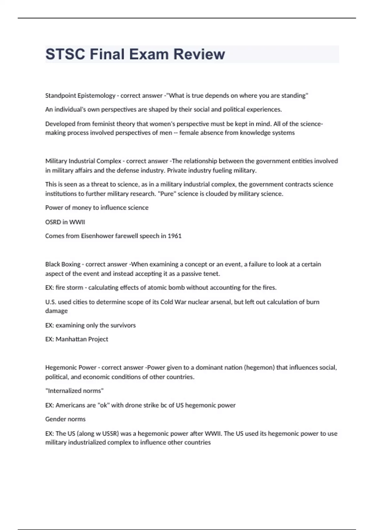 Standpoint Epistemology "What is true depends on where you are standing" An individual's own perspectives are shaped by their social and political experiences. Developed from feminist theory that women's perspective must be kept in mind. All of the science-making process involved perspectives of men -- female absence from knowledge systems Military Industrial Complex The relationship between the government entities involved in military affairs and the defense industry. Private industry fueling military. This is seen as a threat to science, as in a military industrial complex, the government contracts science institutions to further military research. "Pure" science is clouded by military science. Power of money to influence science OSRD in WWII Comes from Eisenhower farewell speech in 1961 Black Boxing When examining a concept or an event, a failure to look at a certain aspect of the event and instead accepting it as a passive tenet. EX: fire storm - calculating effects of atomic bomb without accounting for the fires. U.S. used cities to determine scope of its Cold War nuclear arsenal, but left out calculation of burn damage EX: examining only the survivors EX: Manhattan Project Hegemonic Power Power given to a dominant nation (hegemon) that influences social, political, and economic conditions of other countries. "Internalized norms" EX: Americans are "ok" with drone strike bc of US hegemonic power Gender norms EX: The US (along w USSR) was a hegemonic power after WWII. The US used its hegemonic power to use military industrialized complex to influence other countries Internalization of existing power norms performed by that power's subjects Teleology A purpose that a particular object is created for. A bomb is created to destroy Philosophical study of nature that describes things based on their apparent purpose