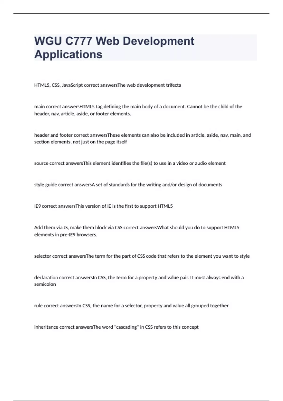 HTML5, CSS, JavaScript correct answersThe web development trifecta main correct answersHTML5 tag defining the main body of a document. Cannot be the child of the header, nav, article, aside, or footer elements. header and footer correct answersThese elements can also be included in article, aside, nav, main, and section elements, not just on the page itself source correct answersThis element identifies the file(s) to use in a video or audio element style guide correct answersA set of standards for the writing and/or design of documents IE9 correct answersThis version of IE is the first to support HTML5 Add them via JS, make them block via CSS correct answersWhat should you do to support HTML5 elements in pre-IE9 browsers. selector correct answersThe term for the part of CSS code that refers to the element you want to style declaration correct answersIn CSS, the term for a property and value pair. It must always end with a semicolon