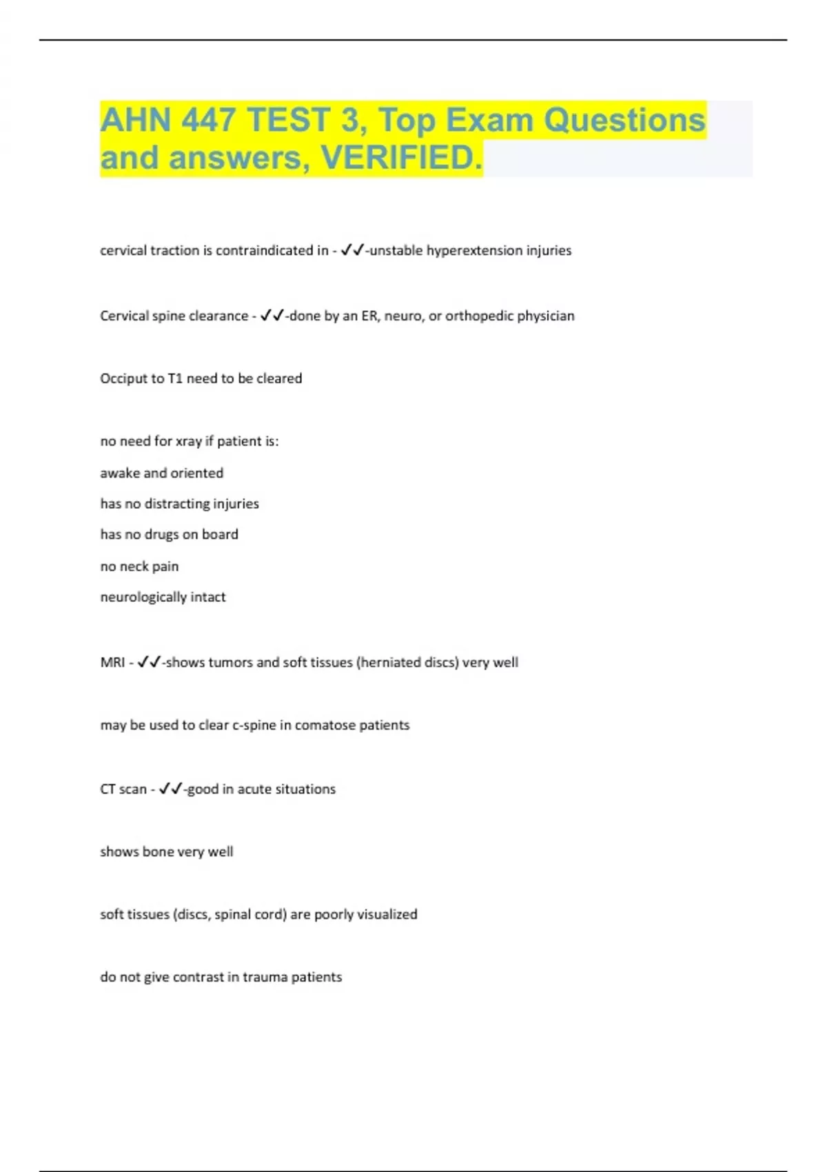 AHN 447 TEST 3, Top Exam Questions and answers, VERIFIED. cervical traction is contraindicated in - -unstable hyperextension injuries Cervical spine clearance - -done by an ER, neuro, or orthopedic physician Occiput to T1 need to be cleared no need for xray if patient is: awake and oriented has no distracting injuries has no drugs on board no neck pain neurologically intact MRI - -shows tumors and soft tissues (herniated discs) very well may be used to clear c-spine in comatose patients CT scan - -good in acute situations shows bone very well soft tissues (discs, spinal cord) are poorly visualized do not give contrast in trauma patients methylprednisolone (solu-medrol) - -only used if started within 8 hours of injury exclusion criteria: cauda equina syndrome, GSW, pregnant, younger than 13, patient is on maintenance steroids management of SCI in hospital - -NGT to suction-prevents aspiration and decompresses the abdomen (paralytic ileus is common in first days) foley-urinary retention is common Central Cord Syndrome - -cervical spine cord involvement with arms more affected than legs. may occur w/ trauma, tumors, infections