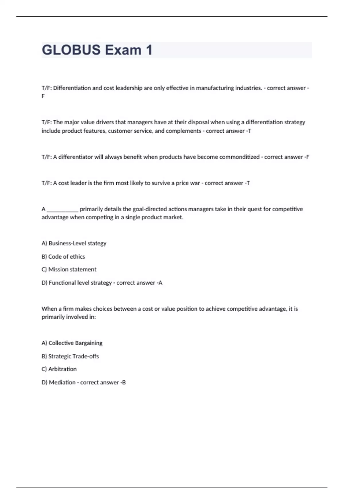 T/F: Differentiation and cost leadership are only effective in manufacturing industries. F T/F: The major value drivers that managers have at their disposal when using a differentiation strategy include product features, customer service, and complements T T/F: A differentiator will always benefit when products have become commonditized F T/F: A cost leader is the firm most likely to survive a price war T A __________ primarily details the goal-directed actions managers take in their quest for competitive advantage when competing in a single product market. A) Business-Level stategy B) Code of ethics C) Mission statement D) Functional level strategy A When a firm makes choices between a cost or value position to achieve competitive advantage, it is primarily involved in: A) Collective Bargaining B) Strategic Trade-offs C) Arbitration D) Mediation B Beach Grub is a chain of "fast casual" restaurants that sells its menu items at higher prices than its competitors. Yet, the restaurant has a large customer base due to its wide product portfolio and superior customer service. Which of the following generic business strategies has Beach Grub adopted in this scenario? A) cost-leadership B) differentiation C) market penetration D) product diversification B