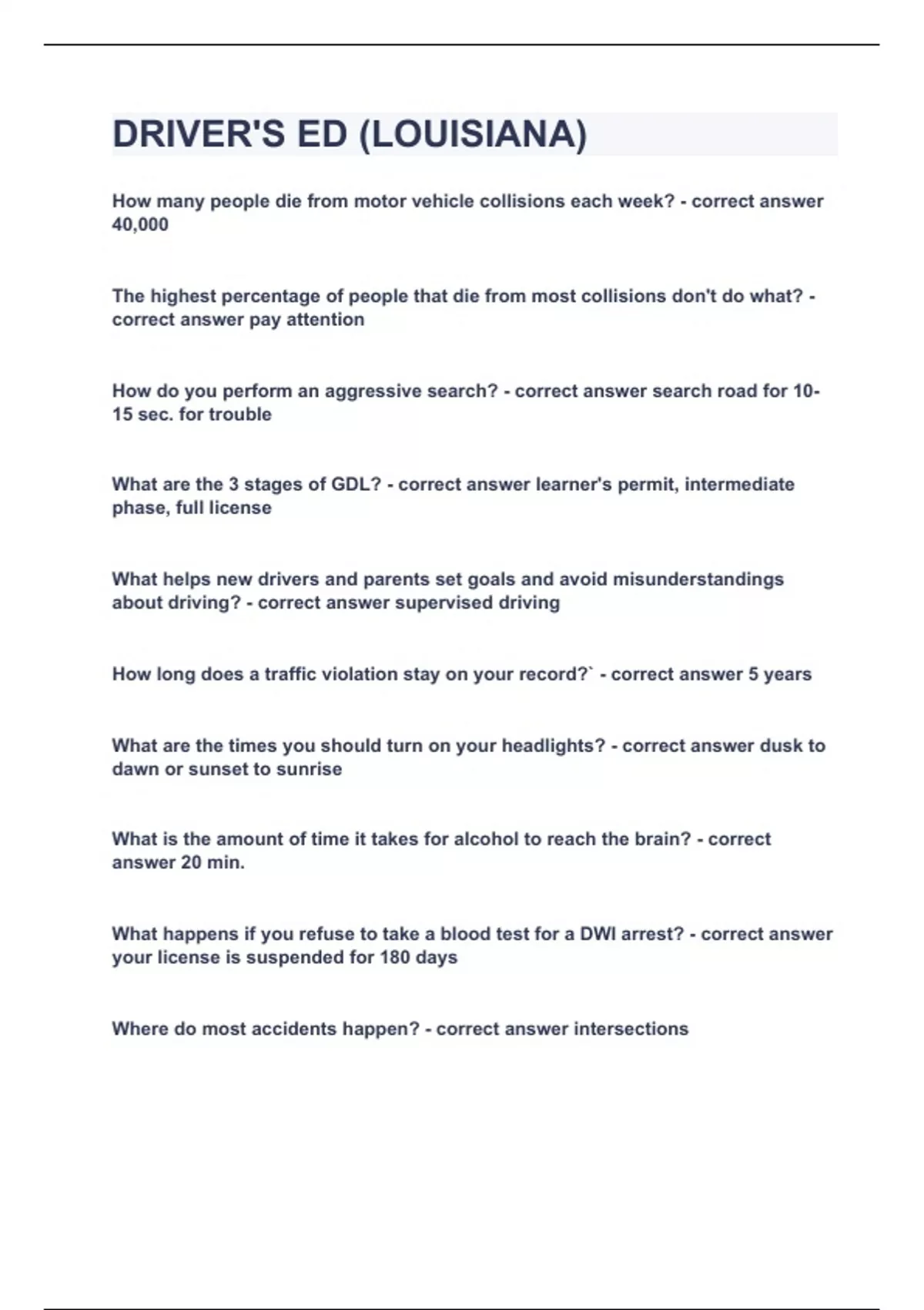 DRIVER'S ED (LOUISIANA)|WITH COMPLETE SOLUTIONS|ALREADY GRADED A|DOWNLOAD TO PASS