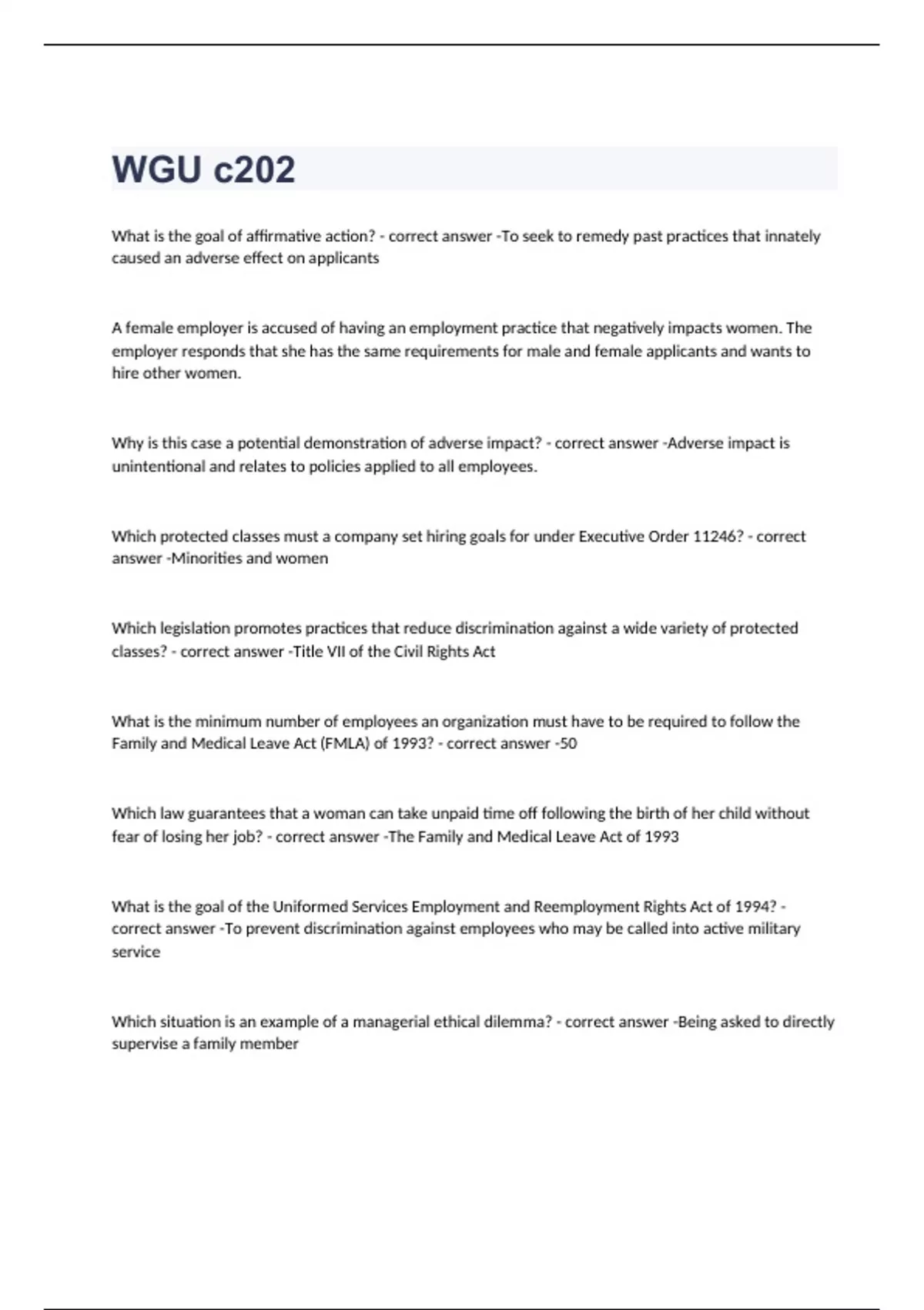 What is the goal of affirmative action? To seek to remedy past practices that innately caused an adverse effect on applicants A female employer is accused of having an employment practice that negatively impacts women. The employer responds that she has the same requirements for male and female applicants and wants to hire other women. Why is this case a potential demonstration of adverse impact? Adverse impact is unintentional and relates to policies applied to all employees. Which protected classes must a company set hiring goals for under Executive Order 11246? Minorities and women Which legislation promotes practices that reduce discrimination against a wide variety of protected classes? Title VII of the Civil Rights Act What is the minimum number of employees an organization must have to be required to follow the Family and Medical Leave Act (FMLA) of 1993? 50 Which law guarantees that a woman can take unpaid time off following the birth of her child without fear of losing her job? The Family and Medical Leave Act of 1993 What is the goal of the Uniformed Services Employment and Reemployment Rights Act of 1994? To prevent discrimination against employees who may be called into active military service Which situation is an example of a managerial ethical dilemma? Being asked to directly supervise a family member A human resource manual specifies that employees cannot be terminated or punished for refusing to follow an illegal request made by a supervisor. Which standard is being applied to resolve this ethical dilemma? Rights standard