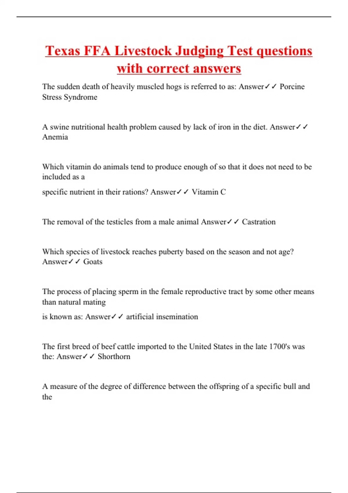 The sudden death of heavily muscled hogs is referred to as: Answer Porcine Stress Syndrome A swine nutritional health problem caused by lack of iron in the diet. Answer Anemia Which vitamin do animals tend to produce enough of so that it does not need to be included as a specific nutrient in their rations? Answer Vitamin C The removal of the testicles from a male animal Answer Castration Which species of livestock reaches puberty based on the season and not age? Answer Goats The process of placing sperm in the female reproductive tract by some other means than natural mating is known as: Answer artificial insemination The first breed of beef cattle imported to the United States in the late 1700's was the: Answer Shorthorn A measure of the degree of difference between the offspring of a specific bull and the offspring of the average bull of the breed in the trait being m