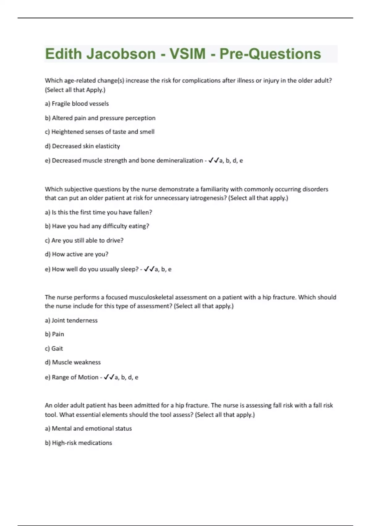 Which age-related change(s) increase the risk for complications after illness or injury in the older adult? (Select all that Apply.) a) Fragile blood vessels b) Altered pain and pressure perception c) Heightened senses of taste and smell d) Decreased skin elasticity e) Decreased muscle strength and bone demineralization - a, b, d, e Which subjective questions by the nurse demonstrate a familiarity with commonly occurring disorders that can put an older patient at risk for unnecessary iatrogenesis? (Select all that apply.) a) Is this the first time you have fallen? b) Have you had any difficulty eating? c) Are you still able to drive? d) How active are you? e) How well do you usually sleep? - a, b, e The nurse performs a focused musculoskeletal assessment on a patient with a hip fracture. Which should the nurse include for this type of assessment? (Select all that apply.) a) Joint tenderness b) Pain c) Gait d) Muscle weakness e) Range of Motion - a, b, d, e An older adult patient has been admitted for a hip fracture. The nurse is assessing fall risk with a fall risk tool. What essential elements should the tool assess? (Select all that apply.) a) Mental and emotional status b) High-risk medicationsc) Nutritional status d) Symptoms of dizziness e) Altered elimination - b, d, e