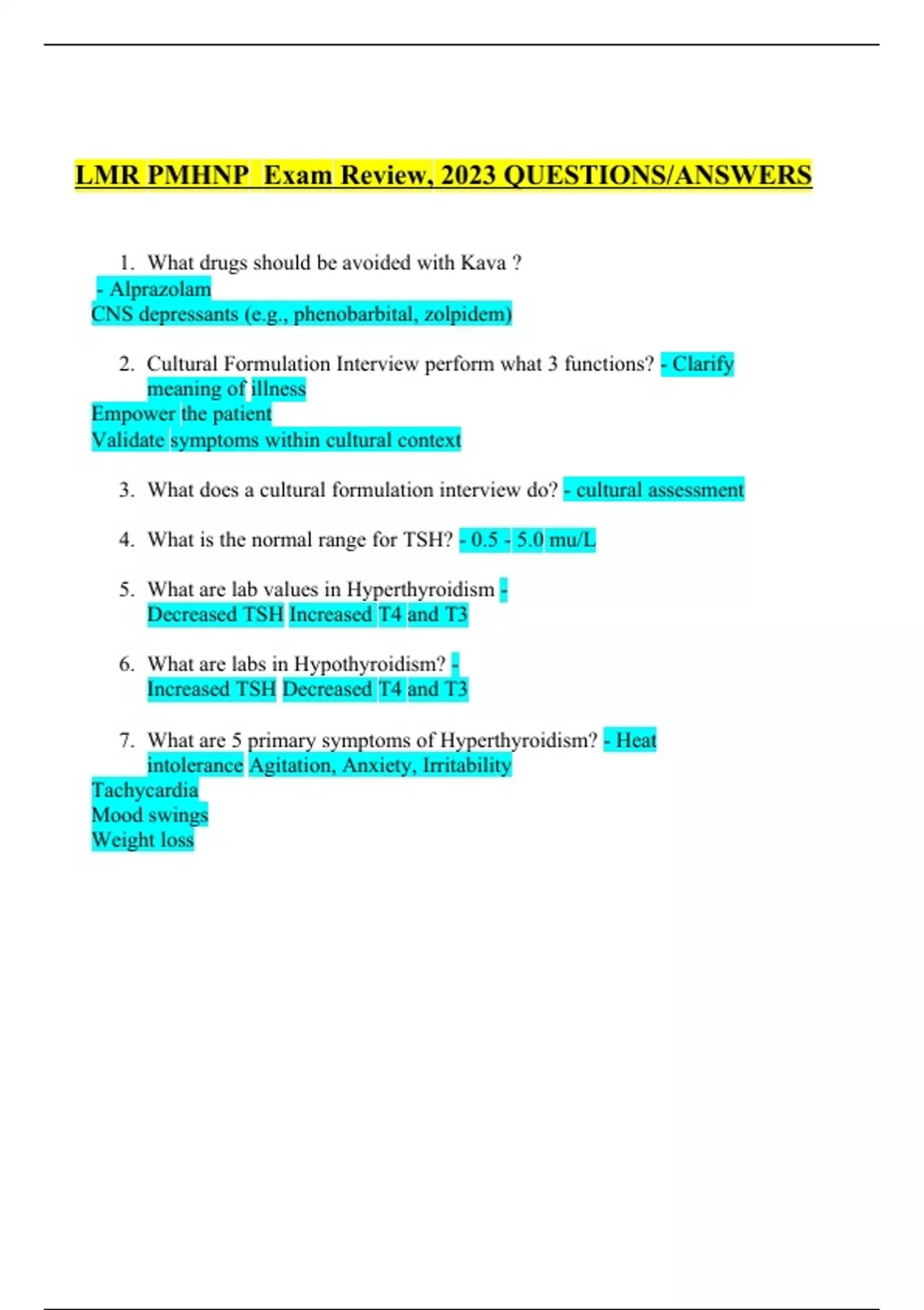 LMR PMHNP Exam Review, 2023 QUESTIONS/ANSWERS 1. What drugs should be avoided with Kava ? - Alprazolam CNS depressants (e.g., phenobarbital, zolpidem) 2. Cultural Formulation Interview perform what 3 functions? - Clarify meaning of illness Empower the patient Validate symptoms within cultural context 3. What does a cultural formulation interview do? - cultural assessment 4. What is the normal range for TSH? - 0.5 - 5.0 mu/L 5. What are lab values in Hyperthyroidism - Decreased TSH Increased T4 and T3 6. What are labs in Hypothyroidism? - Increased TSH Decreased T4 and T3 7. What are 5 primary symptoms of Hyperthyroidism? - Heat intolerance Agitation, Anxiety, Irritability Tachycardia Mood swings Weight loss
