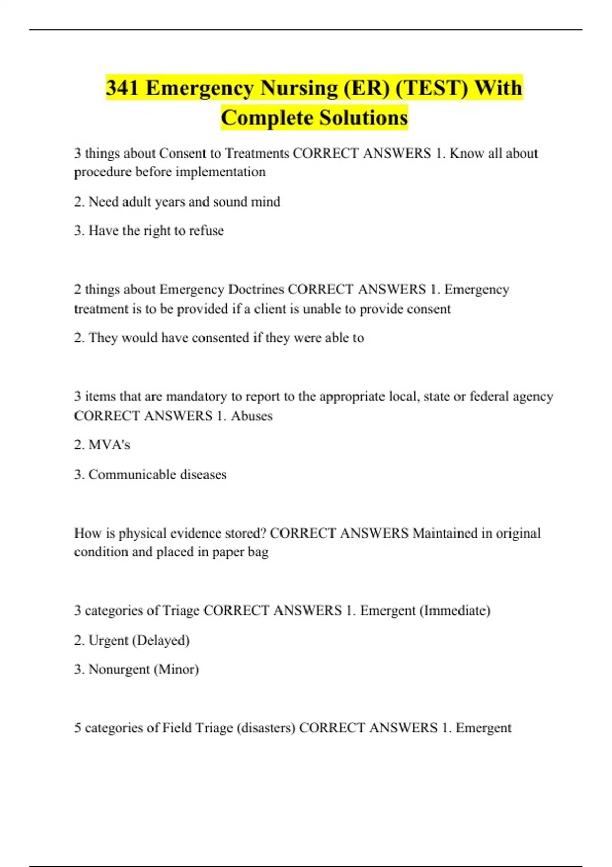 341 Emergency Nursing (ER) (TEST) With Complete Solutions