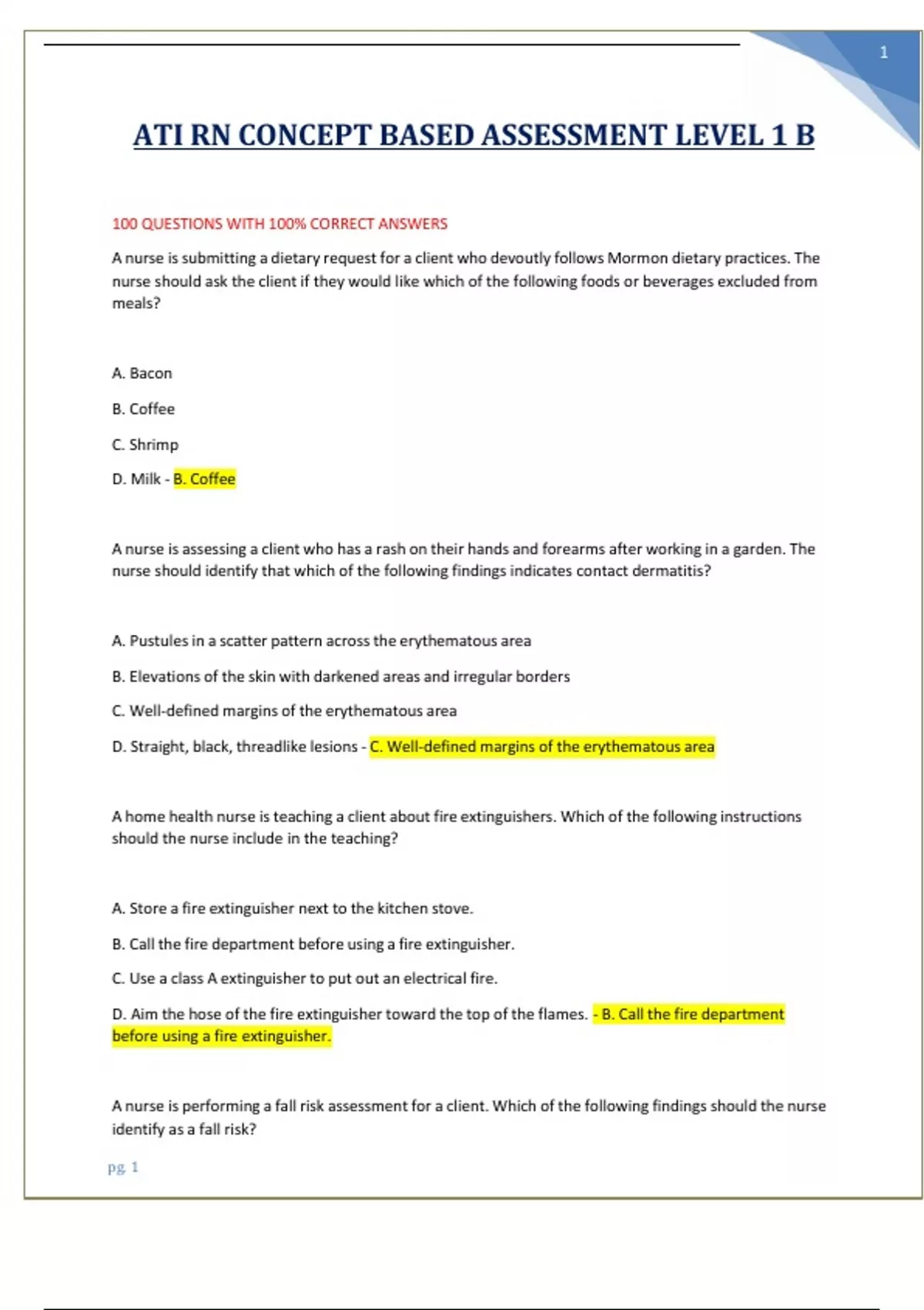 ATI RN CONCEPT BASED ASSESSMENT LEVEL 1 B 100 QUESTIONS WITH 100% CORRECT ANSWERS A nurse is submitting a dietary request for a client who devoutly follows Mormon dietary practices. The nurse should ask the client if they would like which of the following foods or beverages excluded from meals? A. Bacon B. Coffee C. Shrimp D. Milk - B. Coffee A nurse is assessing a client who has a rash on their hands and forearms after working in a garden. The nurse should identify that which of the following findings indicates contact dermatitis? A. Pustules in a scatter pattern across the erythematous area B. Elevations of the skin with darkened areas and irregular borders C. Well-defined margins of the erythematous area D. Straight, black, threadlike lesions - C. Well-defined margins of the erythematous area A home health nurse is teaching a client about fire extinguishers. Which of the following instructions should the nurse include in the teaching? A. Store a fire extinguisher next to the kitchen stove. B. Call the fire department before using a fire extinguisher. C. Use a class A extinguisher to put out an electrical fire. D. Aim the hose of the fire extinguisher toward the top of the flames. - B. Call the fire department before using a fire extinguisher. A nurse is performing a fall risk assessment for a client. Which of the following findings should the nurse identify as a fall risk? A. The client uses a raised toilet seat. B. The client takes a flaxseed supplement. C. The client looks at the ground while walking. D. The client has a history of urinary frequency. - D. The client has a history of urinary frequency. A client who has a history of urinary frequency is at risk for a fall due to frequently getting out of bed at night to go to the bathroom. The nurse should place a commode next to the client's bed to reduce the risk for injury A nurse is assessing a 10-month-old infant who has a urinary tract infection (UTI). which of the following findings should the nurse expect? A. Decreased appetite B. Generalized rash C. Decreased respiratory rate D. Constipation - A. Decreased appetite Manifestations of a UTI in an infant include poor feeding, irritability, fever, and vomiting A nurse is preparing to administer acetaminophen drops 60 mg PO to an infant who has a fever. The amount available is 160mg/5 mL. How many mL should the nurse administer? (Round the answer to the nearest tenth. Use a leading zero if it applies. Do not use a training zero.) - 1.9mL A nurse is teaching a client to self-administer 8 units of NPH insulin and 2 units of regular insulin in the same syringe. Which of the following client statements indicates an understanding of the teaching? A. "I'll draw up regular insulin into the syringe before the NPH insulin." B. "I'll inject air into the regular insulin vial before the NPH vial." C. "I'll inject 10 units of air into the regular insulin vial." D. "I'll inject 10 units of air into the NPH insulin vial." - A. "I'll draw up regular insulin into the syringe before the NPH insulin." A nurse on a mental health unit is planning an in-service for a newly hired staff about the use of restraints. Which of the following information should the nurse include? A. Document a client's condition every 15 min while in restraints. B. Request a prescription for PRN restraints for a client who has a history of violence. C. Restrain a client as a consequence of not following rules on the unit. D. Limit the time an adult client is in restraints to 5 hr. - A. Document a client's condition every 15 min while in restraints. A nurse is a part of an informatics committee to improve safety with medications administration. Which of the following recommendations should the nurse make to decrease the risk of errors at the bedside? A. Disable Internet access from computers used for medication administration. B. Use an electronic medication administration record for documentation. C. Create a computer-specific password that staff share for each computer on the unit. D. Ask providers to handwrite prescriptions that are then scanned into the computer. - B. Use an electronic medication administration record for documentation. A nurse is discussing informed consent with a group of newly licensed nurses. Which of the following actions is the responsibility of the nurses when obtaining informed consent? A. Answer a client's questions about the risks of a procedure. B. Provide information about alternative treatment options. C. Explain the steps of the medical procedure documented on the consent form. D. Verify that the client voluntarily gave consent for the procedure. - D. Verify that the client voluntarily gave consent for the procedure A nurse is teaching a client who has a new diagnosis of obstructive sleep apnea. Which of the following statements should the nurse include? A. "Obstructive sleep apnea occurs when you stop breathing for at least 10 seconds." B. "Obstructive sleep apnea is caused by a dysfunction in the brain." C. "Obstructive sleep apnea increases your risk for developing diabetes mellitus." D. "Obstructive sleep apnea causes excessive episodes of deep sleep." - A. "Obstructive sleep apnea occurs when you stop breathing for at least 10 seconds." A nurse is teaching the parent of a 5-month-old infant who is breastfed about the introductions of complementary foods. Which of the following statements should the nurse make? A. "Wait until your baby is 8 months old to begin solid foods." B. "Start by spoon-feeding your baby ¼ cup of a new food." C. "Introduce up to three new foods to your baby every week." D. "Give your baby iron-fortified infant rice cereals before starting other foods." - D. "Give your baby iron-fortified infant rice cereals before starting other foods." A nurse is teaching a group of newly licensed nurses about using abbreviations when transcribing prescriptions. Which of the following transcriptions should the nurse use as an example of the correct usage of abbreviations? A. Eszop