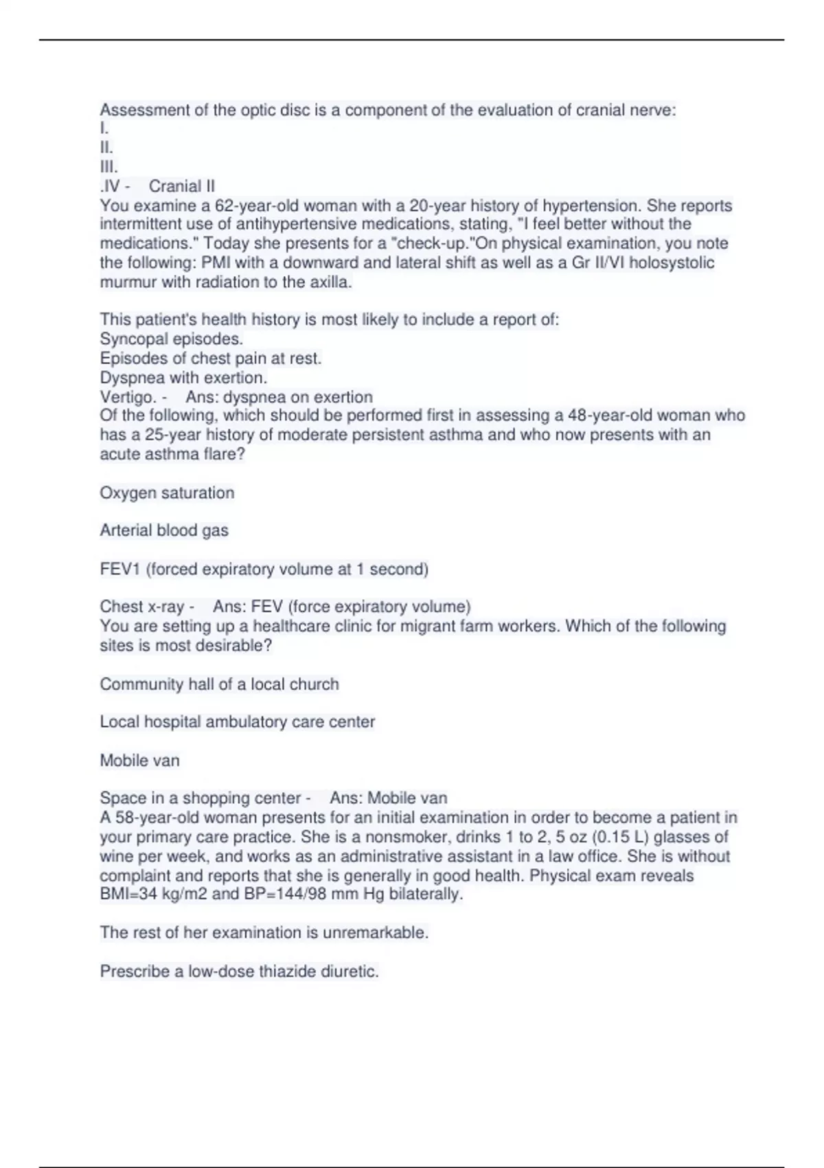 FNP Certification Exam Questions verified and 5 stars rated Arrange for additional blood pressure measurements within the next four weeks. Order a serum creatinine, urea nitrogen and urinalysis. Advise restricting sodium intake and limiting alcohol intake to no more than 1 glass of wine per week. - Ans: Arrange for additional blood pressure measurements within the next four weeks. The NP demonstrates fulfillment of the advanced practice nursing leadership role by participating in which of the following activities? Teaching a 56-year-old man with newly-diagnosed type 2 diabetes mellitus about the importance of self-glucose monitoring Volunteering to teach a class on contraceptive methods to a group of teen mothers Discussing barriers to achieving blood pressure control with a 65-year-old woman with hypertension who "does not want to take any medicine" Collaborating with the regional public health department on an initiative to combat obesity through a community-based exercise program - Ans: Collaborating with the regional public health department on an initiative to combat obesity through a community-based exercise program You are asked to speak to a group of healthcare executives on the NP role. Which of the following provides the strongest support for NP practice? Number of academic credits earned during the NP program Evidence of NP practice outcomes The quantity of clinical hours and type of clinical rotations in the NP program The professional experience of the person prior to entering the NP program - Ans: Evidence of NP practice outcomes Rank the following from highest (1) to lowest (4) level of research design. __Case reports __Meta-analysis __Randomized controlled t