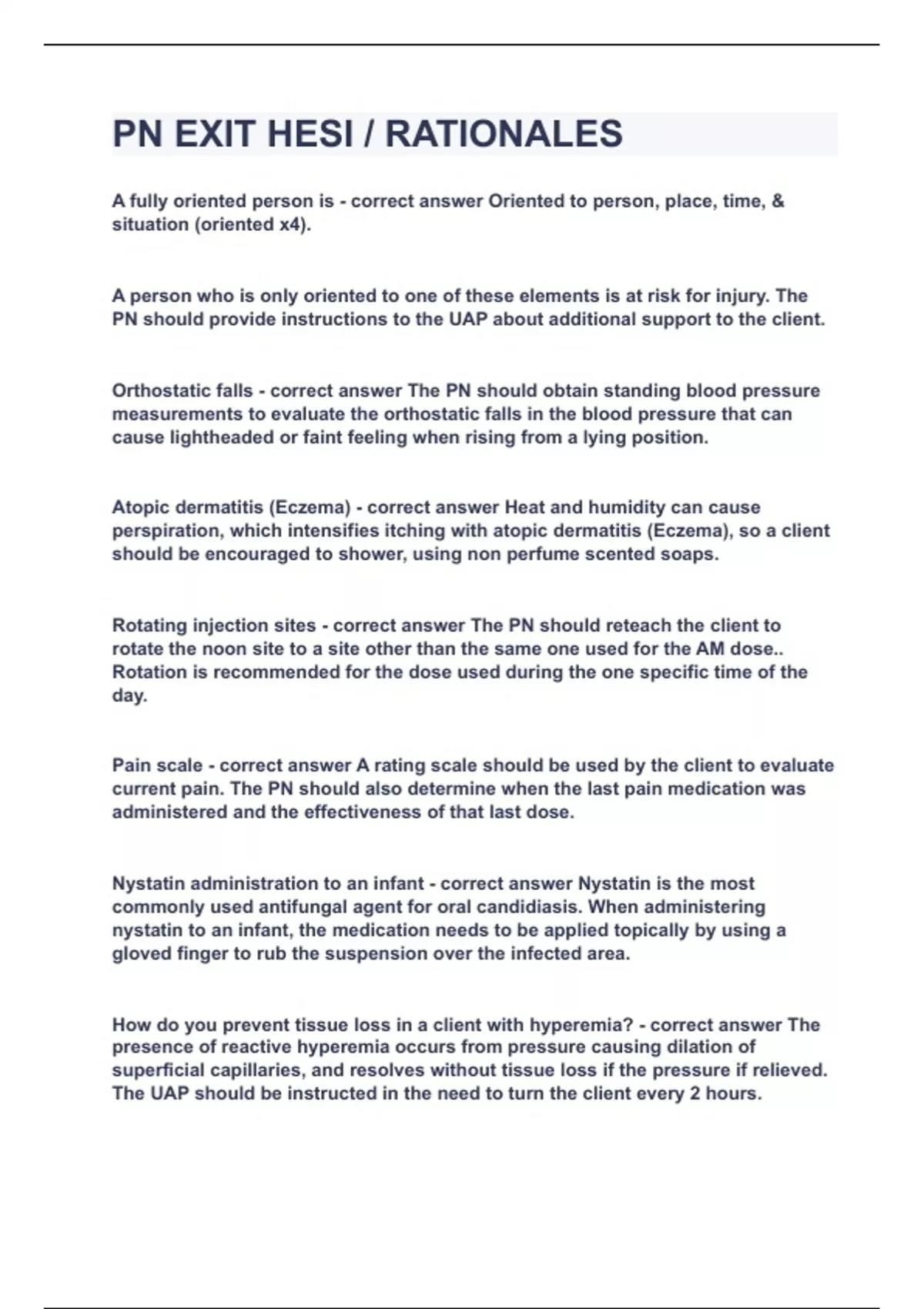 A fully oriented person is Oriented to person, place, time, & situation (oriented x4). A person who is only oriented to one of these elements is at risk for injury. The PN should provide instructions to the UAP about additional support to the client. Orthostatic falls The PN should obtain standing blood pressure measurements to evaluate the orthostatic falls in the blood pressure that can cause lightheaded or faint feeling when rising from a lying position. Atopic dermatitis (Eczema) Heat and humidity can cause perspiration, which intensifies itching with atopic dermatitis (Eczema), so a client should be encouraged to shower, using non perfume scented soaps. Rotating injection sites The PN should reteach the client to rotate the noon site to a site other than the same one used for the AM dose.. Rotation is recommended for the dose used during the one specific time of the day. Pain scale A rating scale should be used by the client to evaluate current pain. The PN should also determine when the last pain medication was administered and the effectiveness of that last dose. Nystatin administration to an infant Nystatin is the most commonly used antifungal agent for oral candidiasis. When administering nystatin to an infant, the medication needs to be applied topically by using a gloved finger to rub the suspension over the infected area. How do you prevent tissue loss in a client with hyperemia? The presence of reactive hyperemia occurs from pressure causing dilation of superficial capillaries, and resolves without tissue loss if the pressure if relieved. The UAP should be instructed in the need to turn the client every 2 hours. PNs role during a fire alarm The PN has the expertise to determine how to safely transport and evacuate residents with varying medical problems during a fire alarm. Intention of droplet precaution Droplet precautions are intended to prevent transmission of pathogens spread through close respiratory or mucous membrane contact with respiratory secretions and include keeping the door to the client's room closed. How should the PN respond to an RN who requested the PN to administer unlabeled medication that the PN did not draw? The PN can respond in an assertive manner by refusing to administer the medication but offering to assist the RN with another task. An aggressive response is refusing to administer the drug while not offering to help in another way. Slight bleeding during stoma care While providing stoma care with a client, it is a normal occurrence to see a little blood on a washcloth due to the stoma being a very vascular site. Upright positioning Sitting upright facilities diaphragm excursion and enhances thoracic and abdominal expansion. What outdoor game provides socialization for older clients? An outdoor team game of ring-toss provides opportunities for socialization, as well as exercise. The activity addresses the older clients' psychosocial, interpersonal and physical needs. Where is the center of gravity in an elderly client? The center of gravity changes as a person age from the hips to the UPPER TORSO. Where can hospice care be provided? Hospice care can be provided anywhere the client lives, including in the home, and focuses on comfort, dignity and emotional support. A living will Describes the clients desires regarding end-of life care, but does not provide specifics regarding hospice care. Under hospice care, medications are used for symptom control but also for routine medical management or treatment of medical problems. The client should plan to make decisions, in collaboration with family members as desired by the client. Presbycusis in older clients Hearing loss. The PN should determine if the client's hearing problem is new or gradual chronic condition. How should the PN approach a elderly client adjusting the a new nursing facility? Relocation often results in confusion among elderly clients during times of adjustment to new surroundings. The PN should remind the client which day it is when she forgets or becomes confused. Airway clearance Airway clearance is the highest priority nursing intervention, and further resuscitative efforts are effective only when the airway is patent. Suctioning clears passages and prevents mucus or feedings from obstructing the airway during resuscitation. The fetal heart rate is 180, what action should the PN take? Although a fetal heart rate of 180 (Normal Range is 110-160) may be an acceleration secondary to fetal movement, this finding should be reported immediately to the RN it indicates tachycardia which requires further assessment. A pregnant client reports contractions that are 7-15 minutes apart, lasting 20-30 seconds with mild intensity. What should the PN instruct her to do? The contractions of true labor generally begin in the back and radiate to the front of the abdomen, and become increasingly regular, stronger and longer-lasting. The client is not yet in active labor and would probably be more comfortable at home until she is in labor. Which food options would you offer a vegetarian client in need of foods high in iron? The client should be encouraged to increase her intake of green leafy vegetables such as Spinach, Broccoli, Kale and other vegetarian sources of iron, such as oatmeal, lentils and black beans. A postpartum client is shaking and states that she is cold. Which action should the PN take? Maternal Vasomotor instability after delivery is usually manifested by uncomfortable shaking and reports of being cold. The PN should apply warmed blankets to provide external warmth. What interventions should be used for a newborn with signs of hypoglycemia? For a newborn who is exhibiting signs of hypoglycemia (Normal Glucose 70-110 mg/Dl or less than 6.1mmol/l or SI units) which is common in infants born to mothers with gestational diabetes, early and prompt feeding should begin to alleviate hypoglycemia. A postpartum clients fundus is elevated above the umbilicus. What action should the PN take? A 