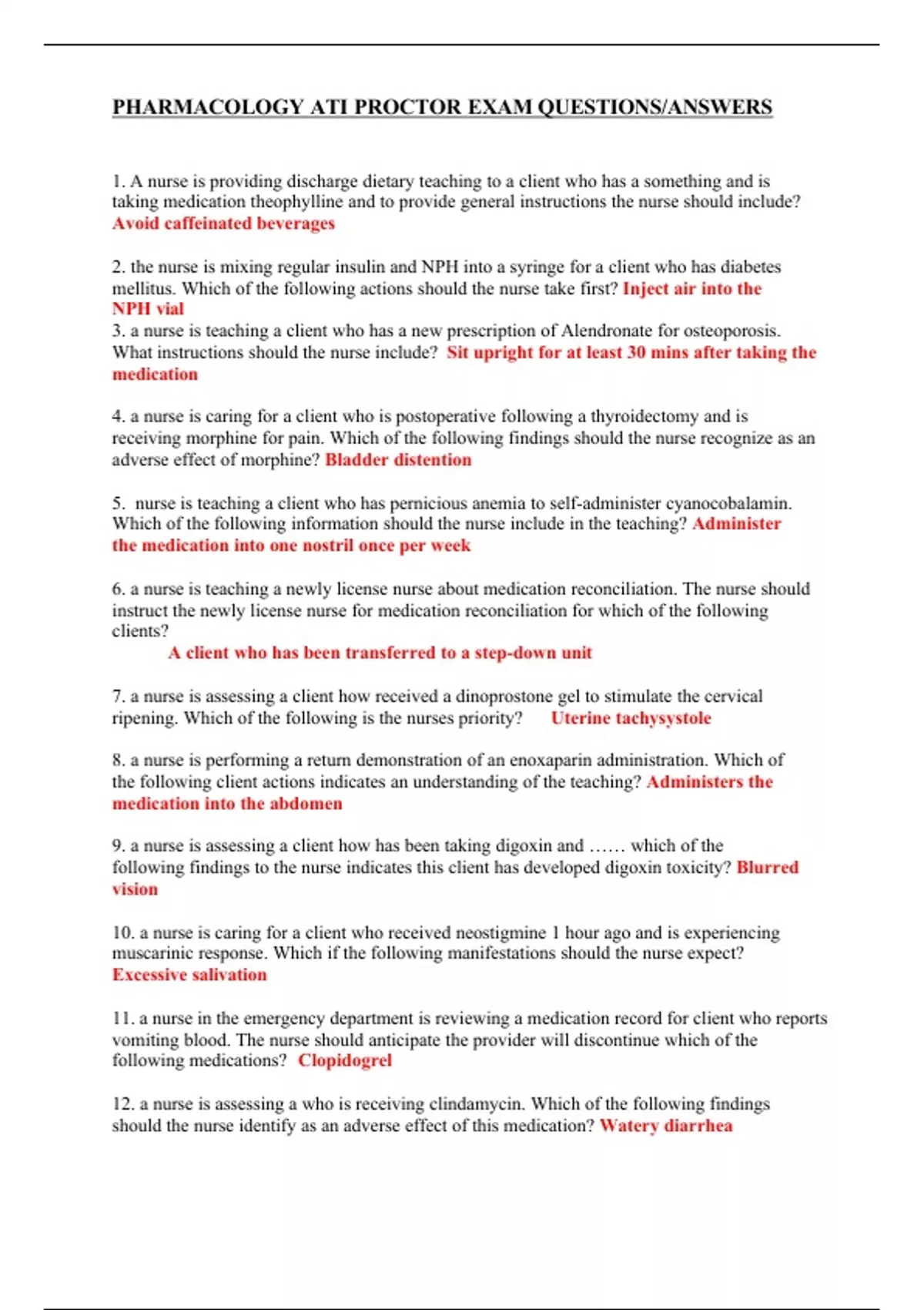 PHARMACOLOGY ATI PROCTOR EXAM QUESTIONS/ANSWERS 1. A nurse is providing discharge dietary teaching to a client who has a something and is taking medication theophylline and to provide general instructions the nurse should include? Avoid caffeinated beverages 2. the nurse is mixing regular insulin and NPH into a syringe for a client who has diabetes mellitus. Which of the following actions should the nurse take first? Inject air into the NPH vial 3. a nurse is teaching a client who has a new prescription of Alendronate for osteoporosis. What instructions should the nurse include? Sit upright for at least 30 mins after taking the medication 4. a nurse is caring for a client who is postoperative following a thyroidectomy and is receiving morphine for pain. Which of the following findings should the nurse recognize as an adverse effect of morphine? Bladder distention 5. nurse is teaching a client who has pernicious anemia to self-administer cyanocobalamin. Which of the following information should the nurse include in the teaching? Administer the medication into one nostril once per week 6. a nurse is teaching a newly license nurse about medication reconciliation. The nurse should instruct the newly license nurse for medication reconciliation for which of the following clients? A client who has been transferred to a step-down unit