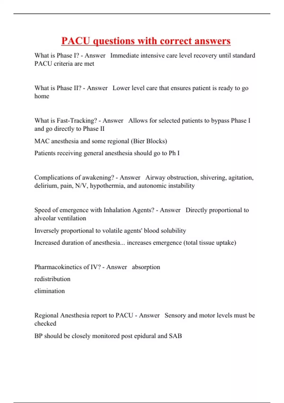 What is Phase I? - Answer Immediate intensive care level recovery until standard PACU criteria are met What is Phase II? - Answer Lower level care that ensures patient is ready to go home What is Fast-Tracking? - Answer Allows for selected patients to bypass Phase I and go directly to Phase II MAC anesthesia and some regional (Bier Blocks) Patients receiving general anesthesia should go to Ph I Complications of awakening? - Answer Airway obstruction, shivering, agitation, delirium, pain, N/V, hypothermia, and autonomic instability Speed of emergence with Inhalation Agents? - Answer Directly proportional to alveolar ventilation Inversely proportional to volatile agents' blood solubility Increased duration of anesthesia... increases emergence (total tissue uptake) Pharmacokinetics of IV? - Answer absorption redistribution elimination