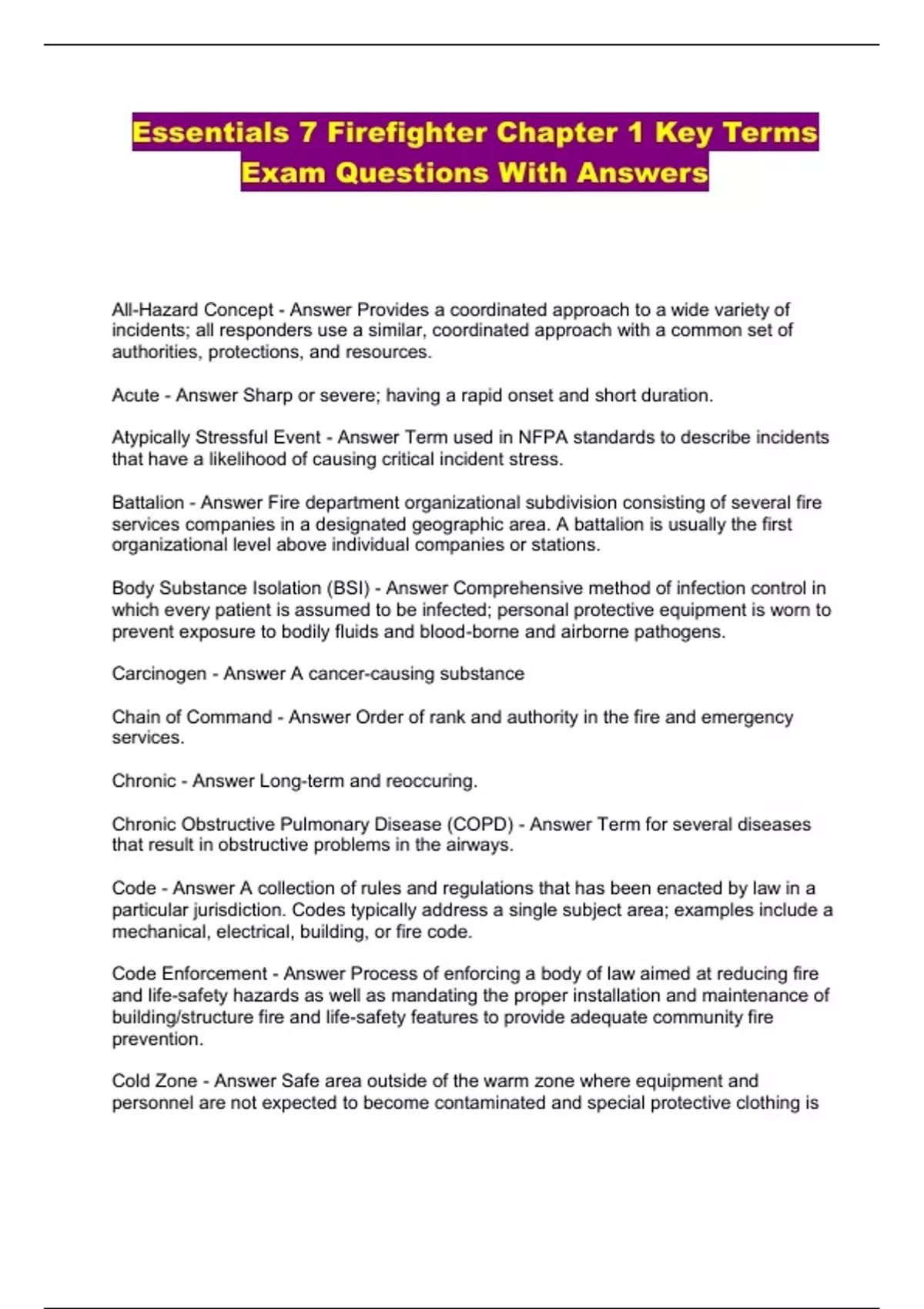Essentials 7 Firefighter Chapter 1 Key Terms Exam Questions With Answers...
