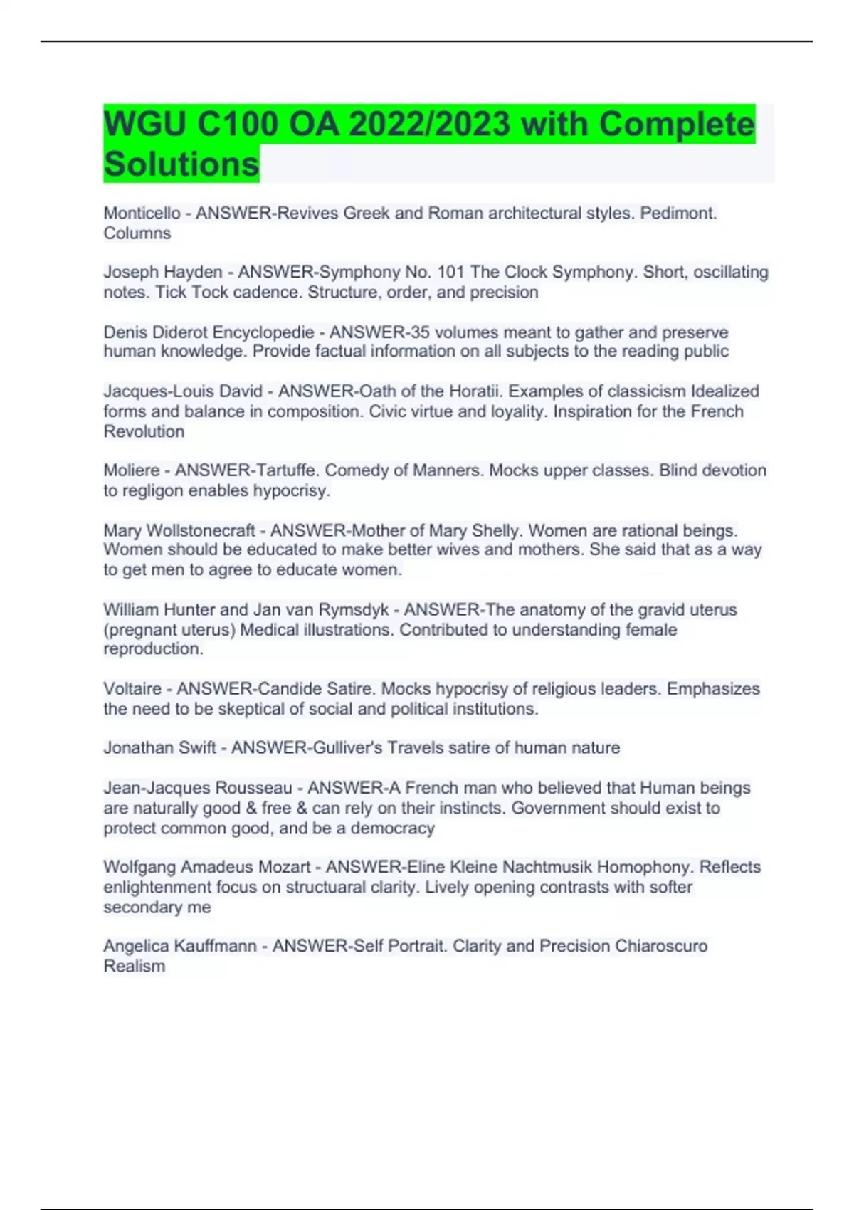 Monticello - ANSWER-Revives Greek and Roman architectural styles. Pedimont. Columns Joseph Hayden - ANSWER-Symphony No. 101 The Clock Symphony. Short, oscillating notes. Tick Tock cadence. Structure, order, and precision Denis Diderot Encyclopedie - ANSWER-35 volumes meant to gather and preserve human knowledge. Provide factual information on all subjects to the reading public Jacques-Louis David - ANSWER-Oath of the Horatii. Examples of classicism Idealized forms and balance in composition. Civic virtue and loyality. Inspiration for the French Revolution Moliere - ANSWER-Tartuffe. Comedy of Manners. Mocks upper classes. Blind devotion to regligon enables hypocrisy. Mary Wollstonecraft - ANSWER-Mother of Mary Shelly. Women are rational beings. Women should be educated to make better wives and mothers. She said that as a way to get men to agree to educate women. William Hunter and Jan van Rymsdyk - ANSWER-The anatomy of the gravid uterus (pregnant uterus) Medical illustrations. Contributed to understanding female reproduction. Voltaire - ANSWER-Candide Satire. Mocks hypocrisy of religious leaders. Emphasizes the need to be skeptical of social and political institutions. Jonathan Swift - ANSWER-Gulliver's Travels satire of human nature Jean-Jacques Rousseau - ANSWER-A French man who believed that Human beings are naturally good & free & can rely on their instincts. Government should exist to protect common good, and be a democracy Wolfgang Amadeus Mozart - ANSWER-Eline Kleine Nachtmusik Homophony. Reflects enlightenment focus on structuaral clarity. Lively opening contrasts with softer secondary me Angelica Kauffmann - ANSWER-Self Portrait. Clarity and Precision Chiaroscuro Realism