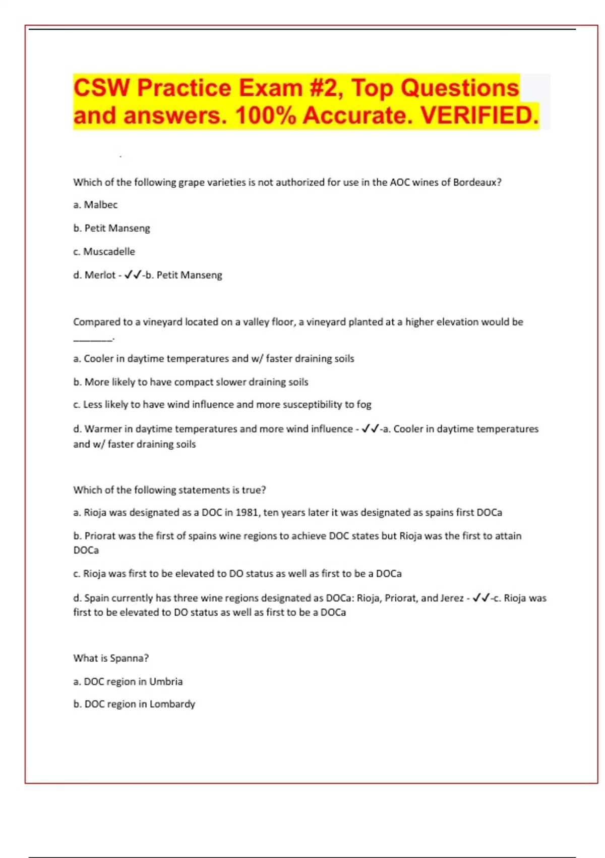 CSW Practice Exam #2, Top Questions and answers. 100% Accurate. VERIFIED. Which of the following grape varieties is not authorized for use in the AOC wines of Bordeaux? a. Malbec b. Petit Manseng c. Muscadelle d. Merlot - -b. Petit Manseng Compared to a vineyard located on a valley floor, a vineyard planted at a higher elevation would be _______. a. Cooler in daytime temperatures and w/ faster draining soils b. More likely to have compact slower draining soils c. Less likely to have wind influence and more susceptibility to fog d. Warmer in daytime temperatures and more wind influence - -a. Cooler in daytime temperatures and w/ faster draining soils Which of the following statements is true? a. Rioja was designated as a DOC in 1981, ten years later it was designated as spains first DOCa b. Priorat was the first of spains wine regions to achieve DOC states but Rioja was the first to attain DOCa c. Rioja was first to be elevated to DO status as well as first to be a DOCa d. Spain currently has three wine regions designated as DOCa: Rioja, Priorat, and Jerez - -c. Rioja was first to be elevated to DO status as well as first to be a DOCa What is Spanna? a. DOC region in Umbria b. DOC region in Lombardy c. Local name for Nebbiolo used in Piedmont d. Local name for Sangiovese used in Tuscany - -c. Local name for Nebbiolo used in Piedmont What is the proper term used for the fermentable product made of the juice, seeds, skins, and sometimes stems of freshly pressed grapes? a. Must b. Lees c. Free run d. Pomace - -a. Must Which of the following is the highest vineyard classification of the Verband Deutscher Pradikatsweinguter system? a. Controllatus Lage b. Erste Lage c. Grosse Lage d. Gutswein Lage - -c. Grosse Lage Which of the following does nto correctly list a grape and its synonym? a. Kekrankos - -Blaufrankisch b. Morellino- Sangiovese c. Chasselas- Fendant d. Weissburgunder-Pinot Gris -d. Weissburgunder-Pinot Gris Which of the following statements is true concerning the wine industry of Austria? a. There are fewer than 40 grape varieties authorized for PDO or PGI level b. Riesling, along with Riesling clone Welschriesling is widely grown c. St Laurent is the most widely grown red grape typically used in rose d. More than 40% of Austrias vineyards are planted to Morillon - -a. There are fewer than 40 grape varieties authorized for PDO or PGI level Which of the following wine regions is located in Slovenia? a. Primorska b. Etalita c. Kaheti d. Struma river valley - -a. Primorska Which of these wines is most likely to be produced using carbonic maceration? a. Chenas b. Beaujolais Nouveau c. Fixin d. Gigondas - -b. Beaujolais Nouveau Vintage Port is aged in a cask but must be bottled by July 30 of the ____ year after harvest. a. Second b. Tenth c. Third d. Fifth - -c. Third The scents that develop in a properly cellared wine over a good length of time are often referred to by which of the following terms? a. Tertiary aromas b. Primary aromas c. Production aromas d. Fermentation aromas - -a. Tertiary aromas Which of the following AVAs is shared between the counties of Napa and Solano? a. Wild Horse Valley b. Chiles Valley c. Los Carneros d. Rockpile - -a. Wild Horse Valley Which of the following German terms indicates a dry wine? a. Lieblich b. Suss c. Trocken d. Feinherb - -c. Trocken Which of the following wines is required to contain a minimum of 75% Sangiovese? a. Chianti Collo Senesi DOCG b. Chianti Classico DOCG c. Vino Nobile di Montepulciano DOCG d. Morellino di Scansano DOCG - -a. Chianti Collo Senesi DOCG Which of the following is a bacterial vine disease? a. Pierces Disease b. Oidium c. Nematodes d. Edalfaule - -a. Pierces Disease Which of the following climate features has the greatest impact on the vineyards of eastern Washington? a. Foothills of Sierra Nevada b. Rain shadow of Cascade Mountains c. Templeton Gap d. Humboldt current - -b. Rain shadow of Cascade Mountains Which of the following acids is often associated with underripe grapes and green apples? a. Lactic b. Acetic c. Malic d. Tartaric - -c. Malic Which of the following wine regions is located in Catalonia? a. Somontano b. Rueda c. Tarragona d. Ribera del Duero - -c. Tarragona Of the following production techniques which would lead to a smaller bubble size in sparkling wine? a. Forced carbonation b. One year of bottle aging on lees c. Three years of bottle aging on lees d. Charmat method - -c. Three years of bottle aging on lees Which of the following grapes is the leading grape of Uruguay? a. Petite Sirah b. Malbec c. Tannat d. Primitvio - -c. Tannat What is Quarts de Chaume? a. Fortified wine from