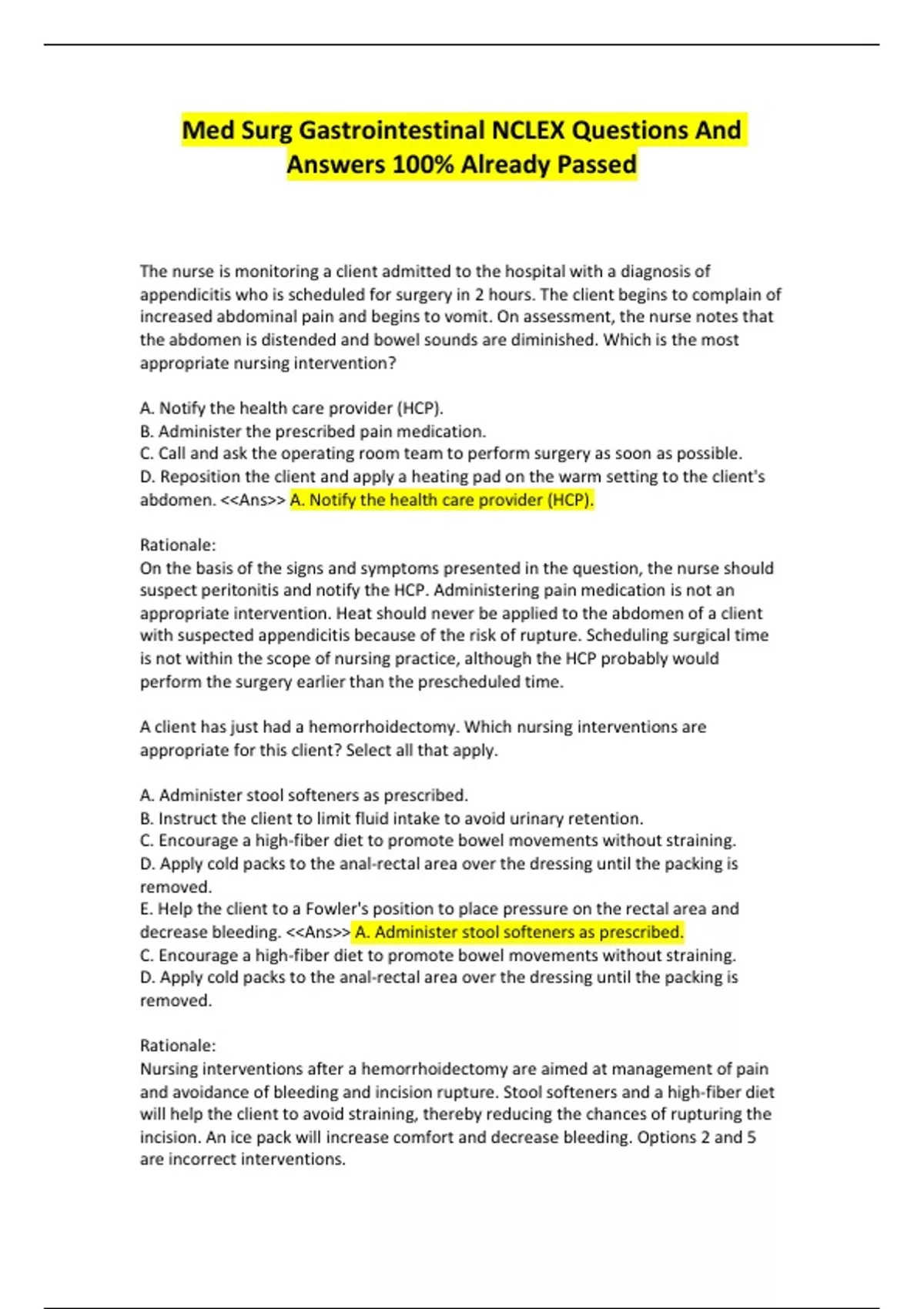 The nurse is monitoring a client admitted to the hospital with a diagnosis of appendicitis who is scheduled for surgery in 2 hours. The client begins to complain of increased abdominal pain and begins to vomit. On assessment, the nurse notes that the abdomen is distended and bowel sounds are diminished. Which is the most appropriate nursing intervention? A. Notify the health care provider (HCP). B. Administer the prescribed pain medication. C. Call and ask the operating room team to perform surgery as soon as possible. D. Reposition the client and apply a heating pad on the warm setting to the client's abdomen. <<Ans>> A. Notify the health care provider (HCP). Rationale: On the basis of the signs and symptoms presented in the question, the nurse should suspect peritonitis and notify the HCP. Administering pain medication is not an appropriate intervention. Heat should never be applied to the abdomen of a client with suspected appendicitis because of the risk of rupture. Scheduling surgical time is not within the scope of nursing practice, although the HCP probably would perform the surgery earlier than the prescheduled time. A client has just had a hemorrhoidectomy. Which nursing interventions are appropriate for this client? Select all that apply. A. Administer stool softeners as prescribed. B. Instruct the client to limit fluid intake to avoid urinary retention. C. Encourage a high-fiber diet to promote bowel movements without straining. D. Apply cold packs to the anal-rectal area over the dressing until the packing is removed. E. Help the client to a Fowler's position to place pressure on the rectal area and decrease bleeding. <<Ans>> A. Administer stool softeners as prescribed. C. Encourage a high-fiber diet to promote bowel movements without straining. D. Apply cold packs to the anal-rectal area over the dressing until the packing is removed. Rationale: Nursing interventions after a hemorrhoidectomy are aimed at management of pain and avoidance of bleeding and incision rupture. Stool softeners and a high-fiber diet will help the client to avoid straining, thereby reducing the chances of rupturing the incision. An ice pack will increase comfort and decrease bleeding. Options 2 and 5 are incorrect interventions. The nurse is planning to teach a client with gastroesophageal reflux disease (GERD) about substances to avoid. Which items should the nurse include on this list? Select all that apply. A. Coffee B. Chocolate C. Peppermint D. Nonfat milk E. Fried chicken F. Scrambled eggs <<Ans>> A. Coffee B. Chocolate C. Peppermint E. Fried chicken Rationale: Foods that decrease lower esophageal sphincter (LES) pressure and irritate the esophagus will increase reflux and exacerbate the symptoms of GERD and therefore should be avoided. Aggravating substances include coffee, chocolate, peppermint, fried or fatty foods, carbonated beverages, and alcohol. Options 4 and 6 do not promote this effect. A client has undergone esophagogastroduodenoscopy. The nurse should place highest priority on which item as part of the client's care plan? 1. Monitoring the temperature 2. Monitoring complaints of heartburn 3. Giving warm gargles for a sore throat 4. Assessing for the return of the gag reflex <<Ans>> 4. Assessing for the return of the gag reflex Rationale: The nurse places highest priority on assessing for return of the gag reflex. This assessment addresses the client's airway. The nurse also monitors the client's vital signs and for a sudden increase in temperature, which could indicate perforation of the gastrointestinal tract. This complication would be accompanied by other signs as well, such as pain. Monitoring for sore throat and heartburn are also important; however, the client's airway is the priority. The nurse is providing dietary teaching for a client with a diagnosis of chronic gastritis. The nurse instructs the client to include which foods rich in vitamin B12 in the diet? Select all that apply. A. Nuts B. Corn C. Liver D. Apples E. Lentils F. Bananas <<Ans>> A. Nuts C. Liver E. Lentils Rationale: Chronic gastritis causes deterioration and atrophy of the lining of the stomach, leading to the loss of function of the parietal cells. The source of intrinsic factor is lost, which results in an inability to absorb vitamin B12, leading to development of pernicious anemia. Clients must increase their intake of vitamin B12 by increasing consumption of foods rich in this vitamin, such as nuts, organ meats, dried beans, citrus fruits, green leafy vegetables, and yeast. The nurse is monitoring a client with a diagnosis of peptic ulcer. Which assessment finding would most likely indicate perforation of the ulcer? A. Bradycardia B. Numbness in the legs C. Nausea and vomiting D. A rigid, boardlike abdomen <<Ans>> D. A rigid, boardlike abdomen