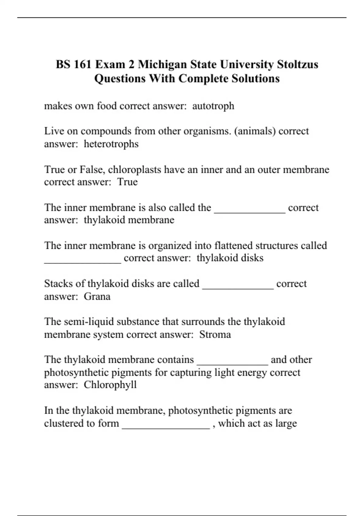 BS 161 Exam 2 Michigan State University Stoltzus Questions With Complete Solutions