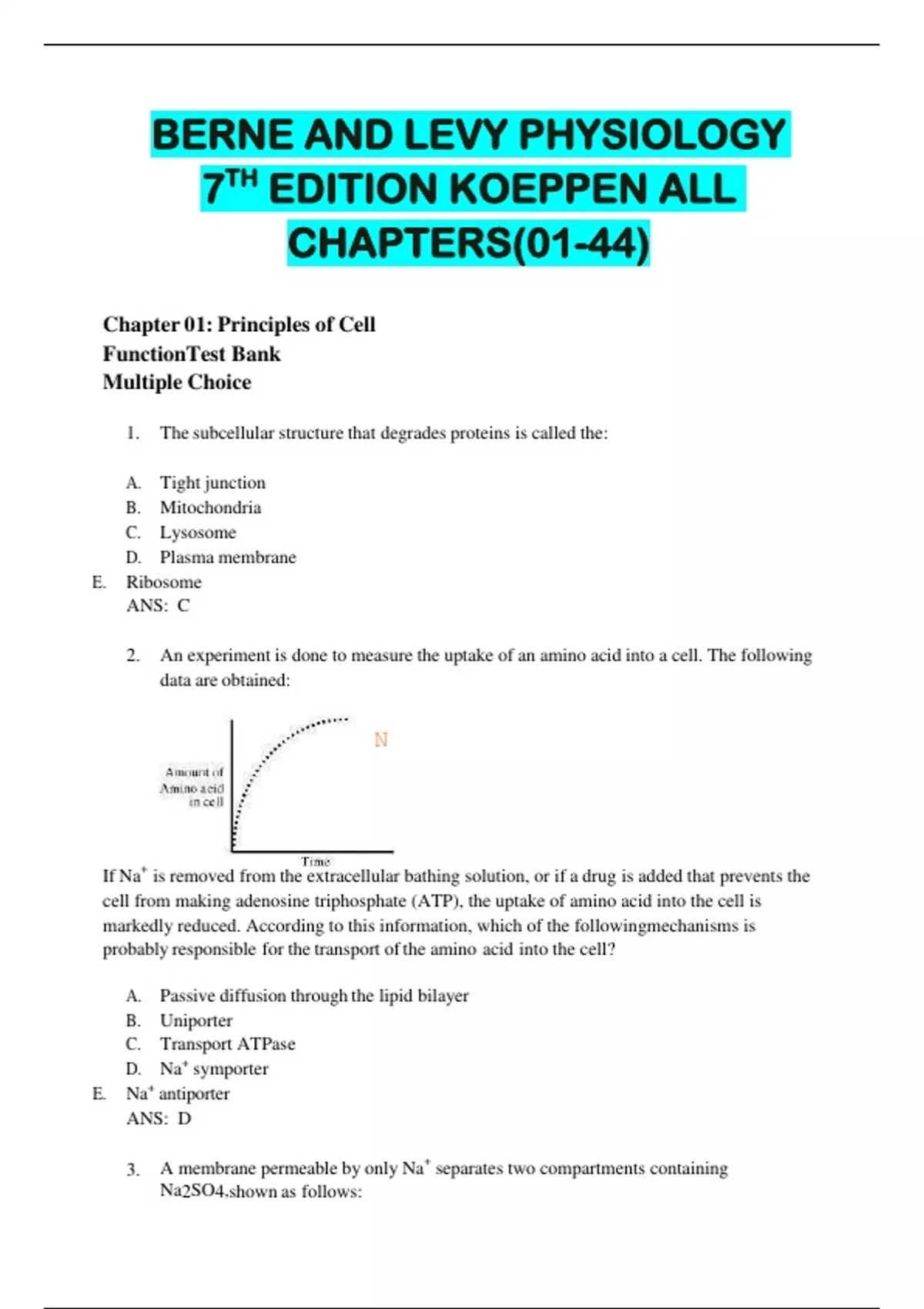 BERNE AND LEVY PHYSIOLOGY 7 TH EDITION KOEPPEN ALL CHAPTERS(01-44) Chapter 01: Principles of Cell FunctionTest Bank Multiple Choice 1. The subcellular structure that degrades proteins is called the: A. Tight junction B. Mitochondria C. Lysosome D. Plasma membrane E. Ribosome ANS: C 2. An experiment is done to measure the uptake of an amino acid into a cell. The following data are obtained: If Na+ is removed from the extracellular bathing solution, or if a drug is added that prevents the cell from making adenosine triphosphate (ATP), the uptake of amino acid into the cell is markedly reduced. According to this information, which of the followingmechanisms is probably responsible for the transport ofthe amino acid into the cell? A. Passive diffusion through the lipid bilayer B. Uniporter C. Transport ATPase D. Na+ symporter E. Na+ antiporter ANS: D 3. A membrane permeable by only Na+ separates two compartments containing Na2SO4,shown as follows: U S N T Electrodes are placed in both compartments, and a voltage is applied (that of compartment A is held at 0 mV). What voltage applied to compartment B would resultin no net movement of Na+ across the membrane separating the compartments? A. –60 mV B. –30 mV C. 0 mV D. +30 mV E. +60 mV ANS: E 4. The resting membrane potentNial oRf aIcellGis –B85.CmV. The intracellular and extracellular concentrations ofseveral ions are indicated in the following table, as is the calculated Nernst equilibrium potential (Ei) for each of these ions: Ion Concentration Inside Cell Concentration Outside Cell Ei Na+ 12 mEq/L 145 mEq/L 66 mV K+ 150 mEq/L 4 mEq/L –96 mV Cl– 30 mEq/L 105 mEq/L –33 mV Ca++ 0.0001 mmol/dL 1 mmol/dL 122 mV The membrane has channels for Na+ , K+ , Cl– , and Ca++. The conductance of the membrane is the greatest for which ion? A. Na+ B. K + C. Cl– D. Ca++ ANS: B 5. A cell contains the following membrane transporters: Na+ channelK+ channel Na+ ,K+ -ATPase The resting membrane voltage of the cell is –80 mV, and the intracellular and extracellular ion concentrations are as follows: Ion Intracellular Concentration Extracellular Concentration Na+ 10 mEq/L 145 mEq/L K+ 120 mEq/L 4 mEq/L The cell is treated with a drug to inhibit the Na+ ,K+ -ATPase. What would be the effect ofthis drug on the following parameters? Intracellular [Na+ ] Intracellular [K+ ] Cell Volume Membrane Voltage A. Decrease Decrease Decrease Depolarize B. Increase Decrease Increase Depolarize C. Increase Increase Increase No change D. Decrease Increase Decrease Hyperpolarize E. Increase Increase Decrease Hyperpolarize ANS: B 6. Which ofthe labeled proteins (shaded) is attached to the membrane by a glycosylphosphatidylinositol (GPI) anchor? ANS: E 7. A cell has channels for Na+ , K+ , and Cl– in its plasma membrane. The resting membrane potential is –60 mV (cell interior negative). The intracellular and extracellular concentrations for these ions, as well as the calculated Nernst potentials, are listed as follows: Ion Intracellular Concentration Extracellular Concentration Ei Na+ 14 mEq/L 140 mEq/L 60 mV K+ 150 mEq/L 5 mEq/L –89 mV Cl– 10 mEq/L 100 mEq/L –60 mV A drug is applied to the cell that increases the permeability of the cell by Cl– (i.e., it opens Cl– channels). What effect will this drug have on the net movement of Cl– acrossthe plasma membrane? A. Net Cl– movement out ofthe cell will be increased. B. Net Cl– movement into the cell will be increased. C. There will be no change in the net movement of Cl– . ANS: C 8. Reducing the extracellular [K+ ] would be expected to have which of the following effects on the resting membrane potential and on the excitability of ventricular myocytes? Membrane Potential Excitability A. Unchanged Unchanged B. Hyperpolarized GDTecBre .aCseOd C. Hyperpolarized Increased D. Depolarized Decreased E. Depolarized Increased ANS: B 9. A cell is bathed in an isotonic NaCl solution that contains 5 mmol/L of glucose. The intracellular concentration of glucose is 10 mmol/L. What is the most likely mechanism for the transport of glucose across the plasma membrane into this cell? A. Glucose uniporter B. Na+ -glucose symporter C. Na+ -glucose antiporter D. Diffusion of glucose through the lipid bilayer of the membrane ANS: B 10. A blood sample is taken from an individual whose blood osmolality is 295 mOsm per kilogram of water. Red blood cells from this sample are then placed in the following solutions: 1-5 Solution Osmolality (mOsm/kg H2O) Reflection Coefficient ( of Solute 1. NaCl 300 1 2. Fructose 300 0.5 3. Urea 300 0 4. CaCl2 100 1 5. KCl 150 1 The red blood cells in which of these solutions will swell to the greatest degree? A. 1 B. 2 C. 3 D. 4 E. 5 ANS: C 11. A solution that causes a cell to shrink is: A. Isotonic B. Hypotonic C. Hypertonic ANS: C 12. Osmosis is: A. The active transport of water B. The number of solute particles in 1 kg of water C. The diffusion of water across cell membranes D. The defined as the weight of a volume of a solution divided by the weight of an equivalent volume of distilled water E. The amount of a substance relative to its molecular weight ANS: C Koeppen: Berne and Levy Physiology, 7th Edition Chapter 02: Homeostasis of Body FluidsTest Bank Multiple Choice 1. A 100 mmol/L solution of MgCl2 would be expected to have an osmolality of which ofthe following? A. 50 mOsm/kg H2O B. 100 mOsm/kg H2O C. 200 mOsm/kg H2O D. 300 mOsm/kg H2O E. 350 mOsm/kg H2O ANS: D 2. Three individuals, each weighing 55 kg and each having a plasma [Na+ ] of 145 mEq/L, receive infusions of different solutions. Individual A receives 1 L of isotonic NaCl (290 mOsm/kg H2O); individual BNrUecReiSvIesN1GLToBf .a mCOanMnitol solution (290 mOsm/kg H2O); and individual C receives 1 L of a 5% dextrose in water (D5W) solution (290 mOsm/kg H2O). Assuming that there is no urine output, and after complete equilibration of the extracellular and intracellular fluid, which of these individuals will have a lower plasma[N