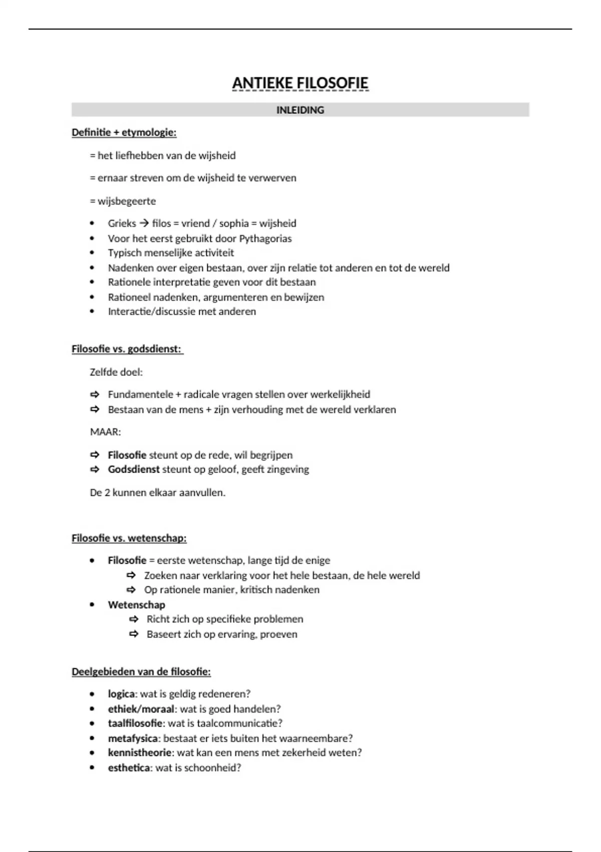 In deze samenvatting vind je info over: de definitie, etymologie en deelgebieden van filosofie, prefilosofische wereldverklaringen, Griekse versus Romeinse filosofie en de filosofie vandaag. Ook de Kosmologische/Presocratische periode met uitleg over alle natuurfilosofen, Pythagoras, de Eleaten, het pluralisme en het atomisme. Als laatste de Atheense/antropologische periode met uitleg over de sofisten, Socrates en de Socratische methode, Plato, de Academie/de school van Athene, de metafysica/zijnsleer, Plato's allegorie van de grot, het dualisme, kennisleer, staatsleer en Aristoteles.