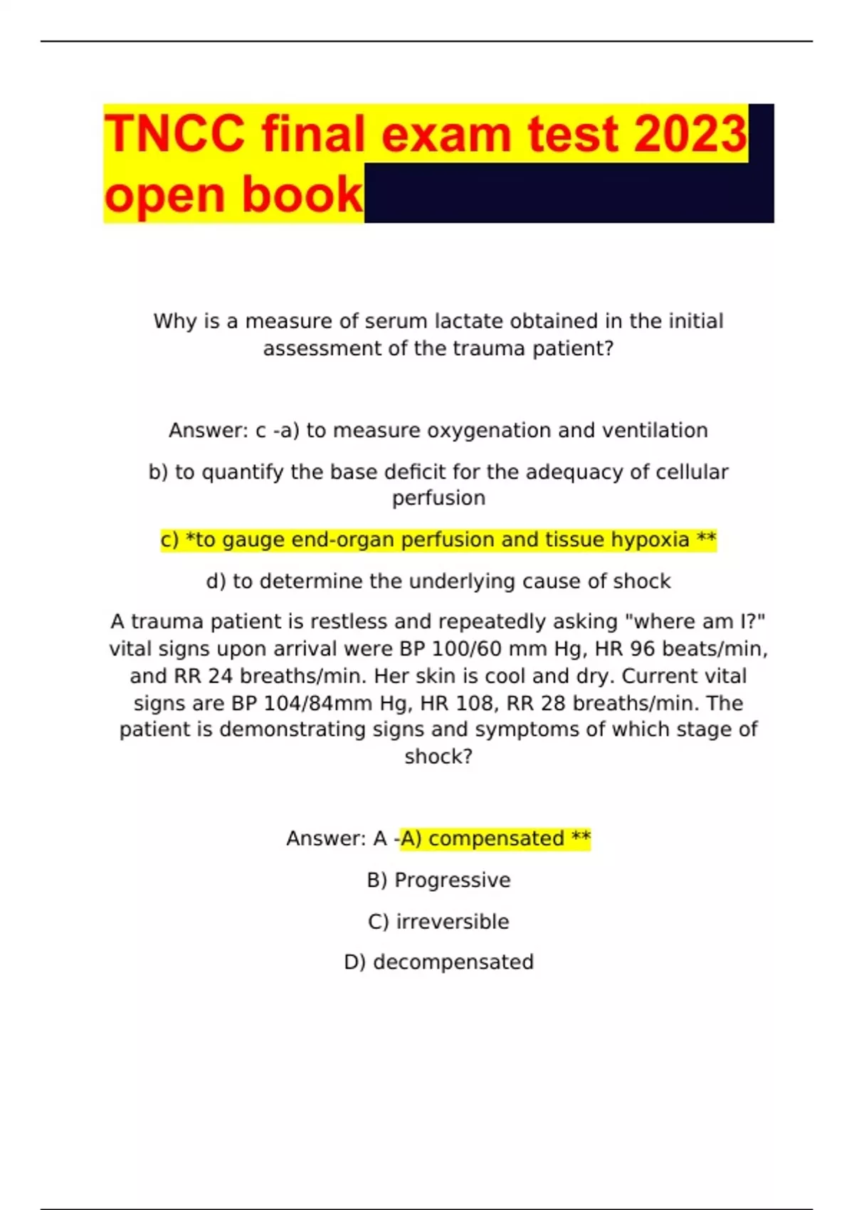 TNCC Final Exam Test 2023 Open Book Graded A+. Why is a measure of serum lactate obtained in the initial assessment of the trauma patient? Answer: c a) to measure oxygenation and ventilation b) to quantify the base deficit for the adequacy of cellular perfusion c) to gauge end-organ perfusion and tissue hypoxia *