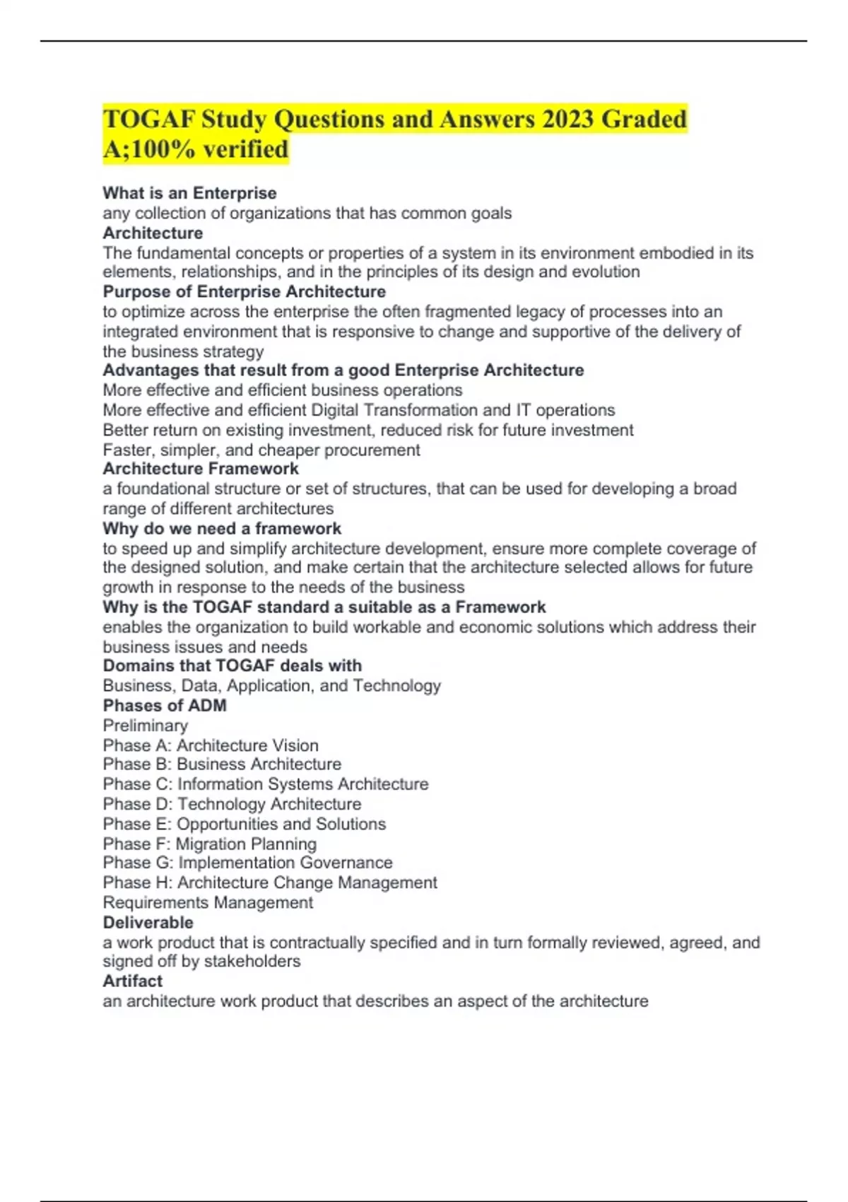 TOGAF Study Questions and Answers 2023 Graded A;100% verified What is an Enterprise any collection of organizations that has common goals Architecture The fundamental concepts or properties of a system in its environment embodied in its elements, relationships, and in the principles of its design and evolution Purpose of Enterprise Architecture to optimize across the enterprise the often fragmented legacy of processes into an integrated environment that is responsive to change and supportive of the delivery of the business strategy Advantages that result from a good Enterprise Architecture More effective and efficient business operations More effective and efficient Digital Transformation and IT operations Better return on existing investment, reduced risk for future investment Faster, simpler, and cheaper procurement Architecture Framework a foundational structure or set of structures, that can be used for developing a broad range of different architectures Why do we need a framework to speed up and simplify architecture development, ensure more complete coverage of the designed solution, and make certain that the architecture selected allows for future growth in response to the needs of the business Why is the TOGAF standard a suitable as a Framework enables the organization to build workable and economic solutions which address their business issues and needs Domains that TOGAF deals with Business, Data, Application, and Technology Phases of ADM Preliminary Phase A: Architecture Vision Phase B: Business Architecture Phase C: Information Systems Architecture Phase D: Technology Architecture Phase E: Opportunities and Solutions Phase F: Migration Planning Phase G: Implementation Governance Phase H: Architecture Change Management Requirements Management Deliverable a work product that is contractually specified and in turn formally reviewed, agreed, and signed off by stakeholders Artifact an architecture work product that describes an aspect of the architecture