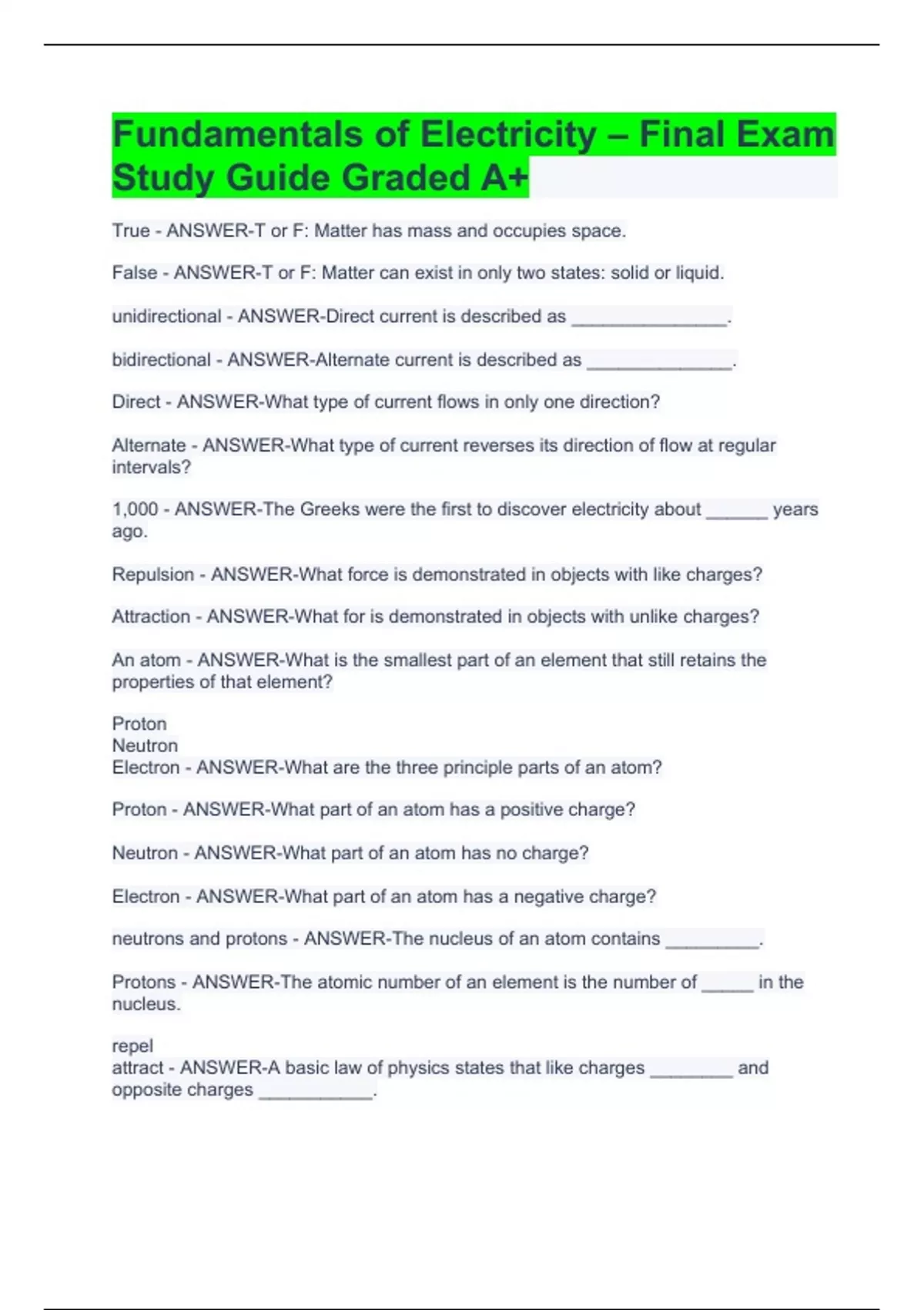 Fundamentals of Electricity – Final Exam Study Guide Graded A+