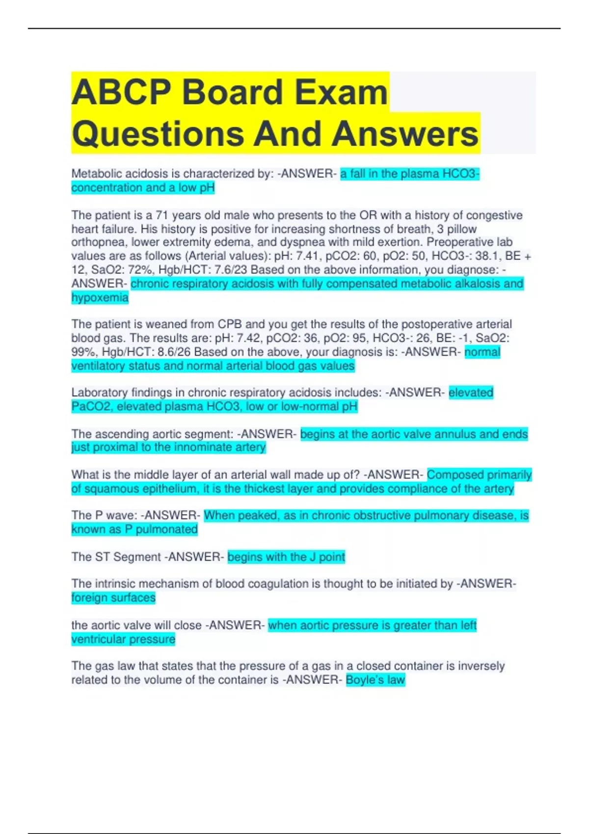 ABCP Board Exam Questions And Answers Metabolic acidosis is characterized by: -ANSWER- a fall in the plasma HCO3- concentration and a low pH The patient is a 71 years old male who presents to the OR with a history of congestive heart failure. His history is positive for increasing shortness of breath, 3 pillow orthopnea, lower extremity edema, and dyspnea with mild exertion. Preoperative lab values are as follows (Arterial values): pH: 7.41, pCO2: 60, pO2: 50, HCO3-: 38.1, BE + 12, SaO2: 72%, Hgb/HCT: 7.6/23 Based on the above information, you diagnose: -ANSWER- chronic respiratory acidosis with fully compensated metabolic alkalosis and hypoxemia The patient is weaned from CPB and you get the results of the postoperative arterial blood gas. The results are: pH: 7.42, pCO2: 36, pO2: 95, HCO3-: 26, BE: -1, SaO2: 99%, Hgb/HCT: 8.6/26 Based on the above, your diagnosis is: -ANSWER- normal ventilatory status and normal arterial blood gas values Laboratory findings in chronic respiratory acidosis includes: -ANSWER- elevated PaCO2, elevated plasma HCO3, low or low-normal pH The ascending aortic segment: -ANSWER- begins at the aortic valve annulus and ends just proximal to the innominate artery What is the middle layer of an arterial wall made up of? -ANSWER- Composed primarily of squamous epithelium, it is the thickest layer and provides compliance of the artery The P wave: -ANSWER- When peaked, as in chronic obstructive pulmonary disease, is known as P pulmonated The ST Segment -ANSWER- begins with the J point The intrinsic mechanism of blood coagulation is thought to be initiated by -ANSWER- foreign surfaces the aortic valve will close -ANSWER- when aortic pressure is greater than left ventricular pressure The gas law that states that the pressure of a gas in a closed container is inversely related to the volume of the container is -ANSWER- Boyle’s law Hypoxia is -ANSWER- an inadequate, reduced tension of cellular oxygen Protamine is: -ANSWER- a poly cation that binds ionically to heparin to produce a stable precipitate Which antihypertensive drug can cause cyanide toxicity? -ANSWER- Nitride Cardiac index is: -ANSWER- equal to cardiac output divided by body surface area During pregnancy, the mothers cardiac output increases by -ANSWER- 30-50% Which of the following techniques should be avoided if a patient has a history of cold agglutination or if it is suspected? -ANSWER- cold blood cardioplegia what issue is at the greatest risk for injury due to cold agglutination on CPB? -ANSWER- Myocardium Which of the following lab results is the most important factor when creating a care plan on CPB for a patient with cold agglutin disease? -ANSWER- The critical temperature What would not cause cold agglutinins to develop? -ANSWER- allergic reaction to platelet inhibitor During bypass for a liver transplant, the patient temperature should be: -ANSWER- maintained at normothermia Ideal pump flow during liver transplant surgery should be: -ANSWER- ½-2/3 of pre bypass cardiac output The circuit that is most commonly used for liver transplant is -ANSWER- Venous Circuit Which of the following vessels are cannulated during liver transplant surgery? -ANSWER- Portal vein, inferior vena cava (femoral vein), internal jugular vein Which of the following is least likely to occur during bypass for liver transplant? -ANSWER- A decrease in systemic vascular resistance A 45 years old patient with a history of end stage liver disease is being evaluated for liver transplantation. The patient gives a history of 60 pack/year cigarette smoking and a history of consuming at least a 12 pack of Budweiser beer a day for 10 years. Based on the above history, which of the following is true? -ANSWER- The patient must prove a history of abstinence from alcohol for at least 6 months Which of the following is not implicated as a cause of end stage renal disease? -ANSWER- Acute Hepatitis A