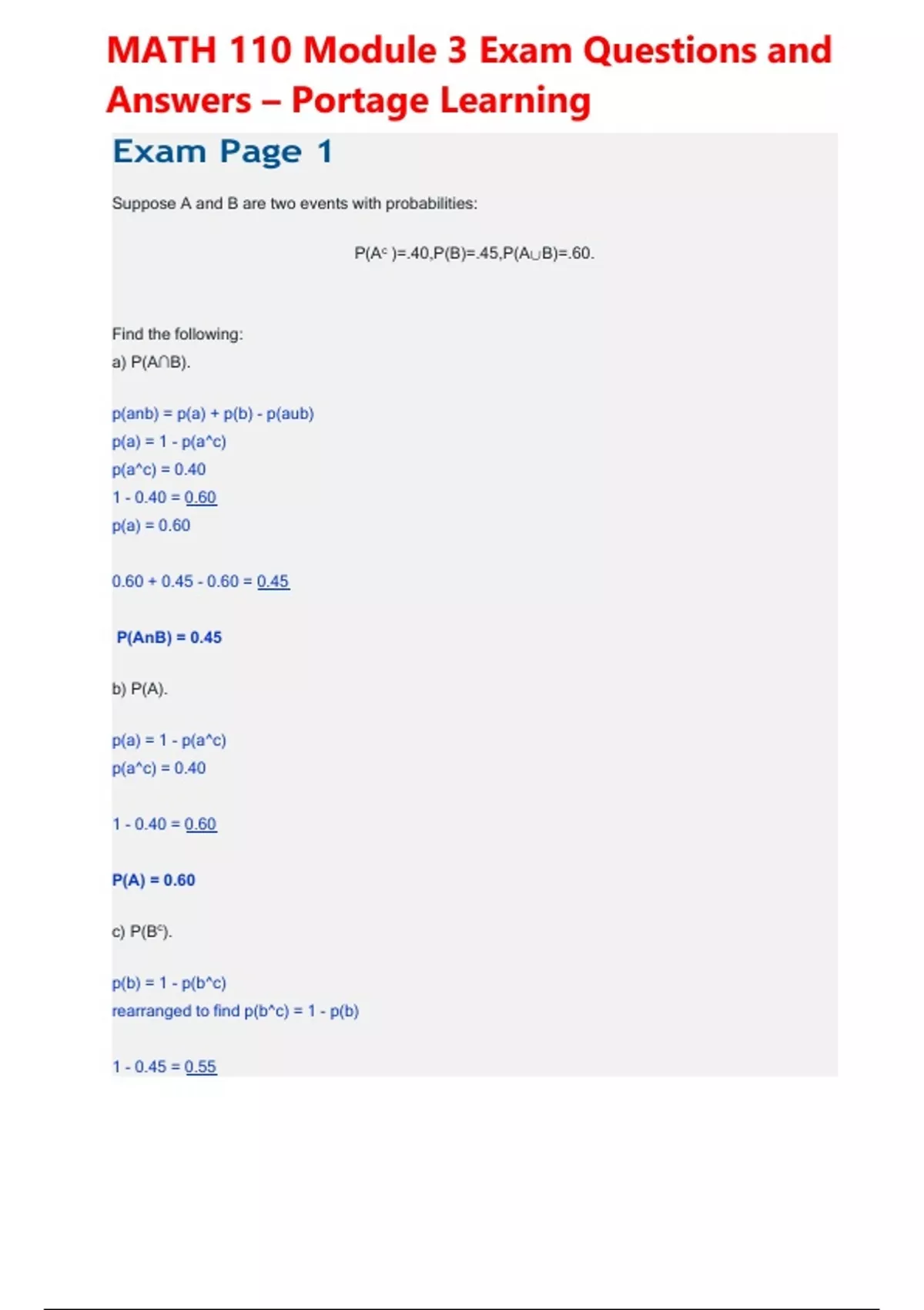 MATH 110 Module 3 Exam Questions and Answers – Portage Learning. Exam Page 1 Suppose A and B are two events with probabilities: P(Ac )=.40,P(B)=.45,P(A∪B)=.60. Find the following: a) P(A∩B). p(anb) = p(a) + p(b) - p(aub) p(a) = 1 - p(a^c) p(a^c) = 0.40 1 - 0.40 = 0.60 p(a) = 0.60 0.60 + 0.45 - 0.60 = 0.45 P(AnB) = 0.45 b) P(A). p(a) = 1 - p(a^c) p(a^c) = 0.40 1 - 0.40 = 0.60 P(A) = 0.60 c) P(Bc ). p(b) = 1 - p(b^c) rearranged to find p(b^c) = 1 - p(b) 1 - 0.45 = 0.55 P(B^c) = 0.55 Answer Key Suppose A and B are two events with probabilities: P(Ac )=.40,P(B)=.45,P(A∪B)=.60. Find the following: a) P(A∩B). For P(A∩B). Use P(A∪B)=P(A)+P(B)-P(A∩B) and rearrange to P(A∩B)=P(A)+P(B)-P(A∪B). But for this equation, we need P(A) which we can find by using P(A)=1- P(A^c ). So, P(A)=1-.40= .60. P(A∩B)=.60+.45-.60=.45. b) P(A). P(A) was found above as .60. c) P(Bc ). For P(Bc ). Use P(B)=1-P(Bc ) which may be rearranged to (Bc )=1-P(B). P(Bc )=1-.45=.55.