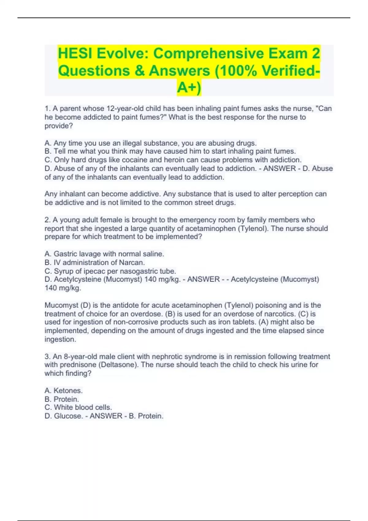 HESI Evolve: Comprehensive Exam 2 Questions & Answers (100% Verified- A+) HESI Evolve: Comprehensive Exam 2 Questions & Answers (100% Verified- A+) 1. A parent whose 12-year-old child has been inhaling paint fumes asks the nurse, "Can he become addicted to paint fumes?" What is the best response for the nurse to provide? A. Any time you use an illegal substance, you are abusing drugs. B. Tell me what you think may have caused him to start inhaling paint fumes. C. Only hard drugs like cocaine and heroin can cause problems with addiction. D. Abuse of any of the inhalants can eventually lead to addiction. - ANSWER - D. Abuse of any of the inhalants can eventually lead to addiction. Any inhalant can become addictive. Any substance that is used to alter perception can be addictive and is not limited to the common street drugs. 2. A young adult female is brought to the emergency room by family members who report that she ingested a large quantity of acetaminophen (Tylenol). The nurse should prepare for which treatment to be implemented? A. Gastric lavage with normal saline. B. IV administration of Narcan. C. Syrup of ipecac per nasogastric tube. D. Acetylcysteine (Mucomyst) 140 mg/kg. - ANSWER - - Acetylcysteine (Mucomyst) 140 mg/kg. Mucomyst (D) is the antidote for acute acetaminophen (Tylenol) poisoning and is the treatment of choice for an overdose. (B) is used for an overdose of narcotics. (C) is used for ingestion of non-corrosive products such as iron tablets. (A) might also be implemented, depending on the amount of drugs ingested and the time elapsed since ingestion. 3. An 8-year-old male client with nephrotic syndrome is in remission following treatment with prednisone (Deltasone). The nurse should teach the child to check his urine for which finding? A. Ketones. B. Protein. C. White blood cells. D. Glucose. - ANSWER - B. Protein.