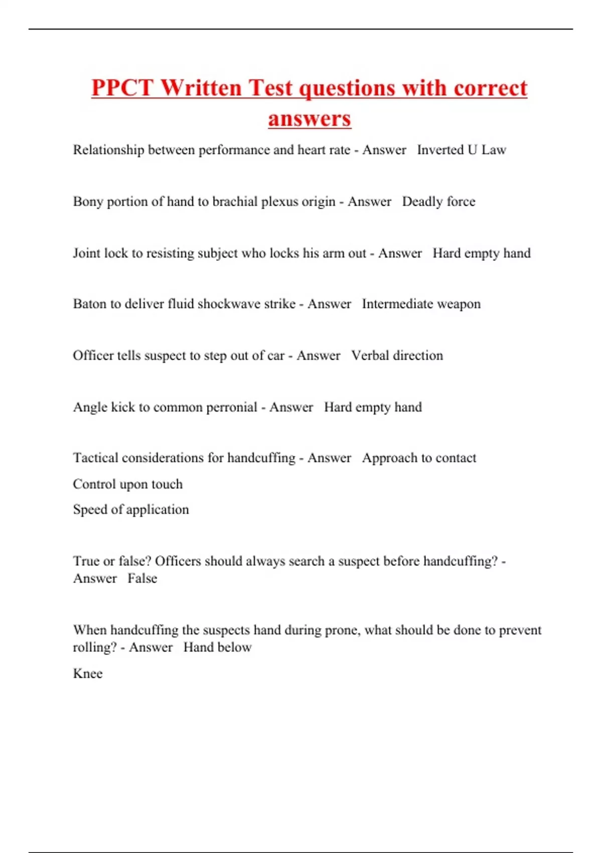 Relationship between performance and heart rate - Answer Inverted U Law Bony portion of hand to brachial plexus origin - Answer Deadly force Joint lock to resisting subject who locks his arm out - Answer Hard empty hand Baton to deliver fluid shockwave strike - Answer Intermediate weapon Officer tells suspect to step out of car - Answer Verbal direction Angle kick to common perronial - Answer Hard empty hand Tactical considerations for handcuffing - Answer Approach to contact Control upon touch Speed of application True or false? Officers should always search a suspect before handcuffing? - Answer False When handcuffing the suspects hand during prone, what should be done to prevent rolling? - Answer Hand below