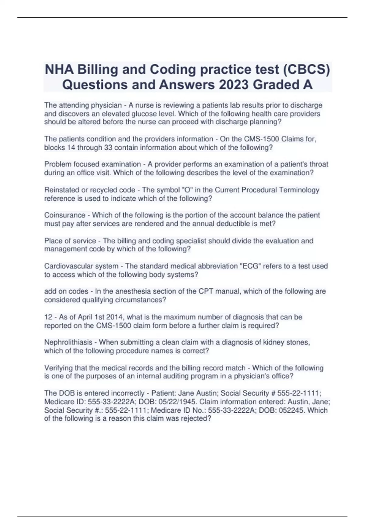 NHA Billing and Coding practice test (CBCS) Questions and Answers 2023 Graded A