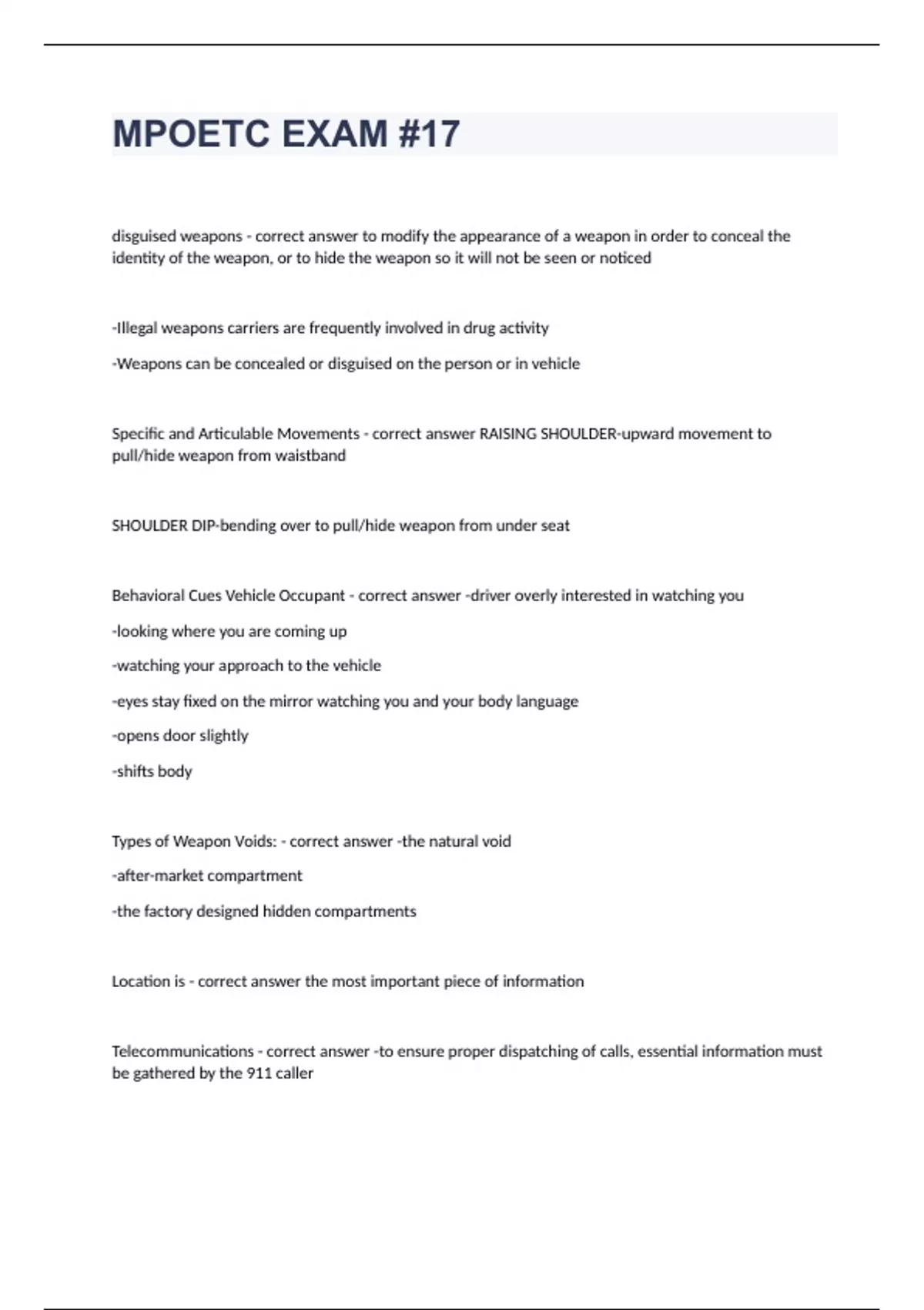 MPOETC EXAM #17disguised weapons to modify the appearance of a weapon in order to conceal the identity of the weapon, or to hide the weapon so it will not be seen or noticed -Illegal weapons carriers are frequently involved in drug activity -Weapons can be concealed or disguised on the person or in vehicle Specific and Articulable Movements RAISING SHOULDER-upward movement to pull/hide weapon from waistband SHOULDER DIP-bending over to pull/hide weapon from under seat Behavioral Cues Vehicle Occupant -driver overly interested in watching you -looking where you are coming up -watching your approach to the vehicle -eyes stay fixed on the mirror watching you and your body language -opens door slightly -shifts body Types of Weapon Voids: -the natural void -after-market compartment -the factory designed hidden compartments Location is the most important piece of information Telecommunications -to ensure proper dispatching of calls, essential information must be gathered by the 911 caller i-Location ii-Caller Information iii-Nature of the Call iv-Is the call in Progress v-Weapons Commonwealth Law Enforcement Assistance Network (CLEAN) -Used by criminal justice agencies to access: driver's license & vehicle info. -State criminal history record info maintained by PA State Police. Justice Network (JNET) -Interfaces with CLEAN to access info on criminal history, arrest data, PFA's & Hot Files. National Crime Information Center (NCIC) -Nationwide, computerized index of criminal justice info: criminal records, fugitives, stolen property, missing persons. When searching for weapons remember... -People can modify clothing. -Companies make concealment clothing. -Virtually any clothing piece can have a weapon. Professionalism -Know your location at all times -Provide life safety updates and checks -Answer when called -Request and act as backup -Ask for clarification when needed -DO NOT be argumentative on the radio Threat -an expression of intent to do harm or act out violently against someone or something