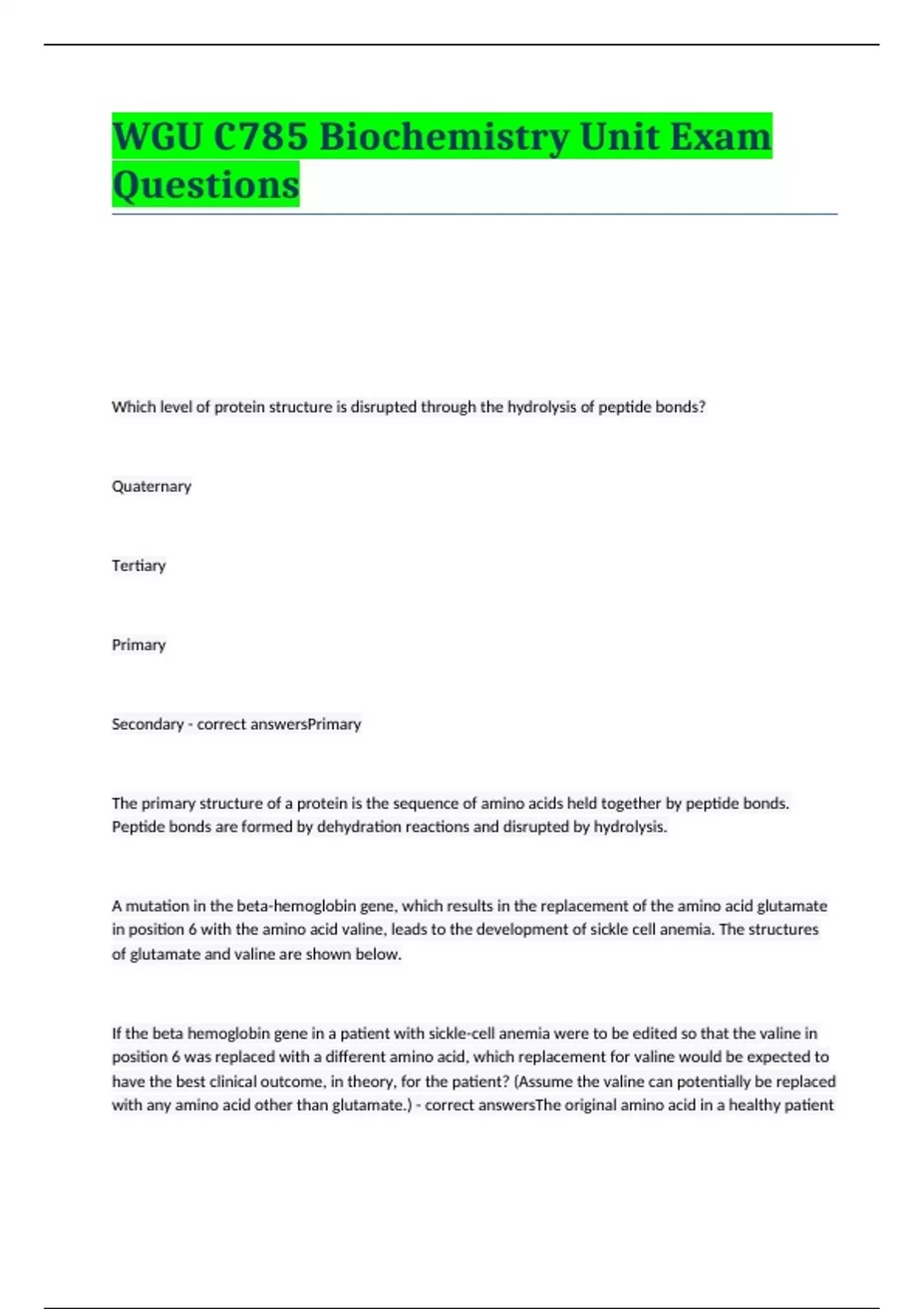 WGU C785 Biochemistry Unit Exam Questions Which level of protein structure is disrupted through the hydrolysis of peptide bonds? Quaternary Tertiary Primary Secondary - correct answersPrimary The primary structure of a protein is the sequence of amino acids held together by peptide bonds. Peptide bonds are formed by dehydration reactions and disrupted by hydrolysis. A mutation in the beta-hemoglobin gene, which results in the replacement of the amino acid glutamate in position 6 with the amino acid valine, leads to the development of sickle cell anemia. The structures of glutamate and valine are shown below. If the beta hemoglobin gene in a patient with sickle-cell anemia were to be edited so that the valine in position 6 was replaced with a different amino acid, which replacement for valine would be expected to have the best clinical outcome, in theory, for the patient? (Assume the valine can potentially be replaced with any amino acid other than glutamate.) - correct answersThe original amino acid in a healthy patient is glutamate, which is negatively charged. The mutated amino acid is valine, which is non-polar. Valine is causing sickle cell anemia. The best amino acid to replace valine so that the patient is healthy again would be the one most like glutamate, so any negatively charged amino acid. Secondary, tertiary, and quaternary levels of protein structure can all be impacted by exposing a protein to which treatment? Change of a hydrophobic amino acid to a different hydrophobic amino acid Addition of a reducing agent Placement of the protein in a solution with a low pH Increase in the concentration of the protein in solution - correct answersPlacement of the protein in a solution with a low pH Changes in pH affect hydrogen bonds and ionic bonds. Hydrogen bonds in the backbone of amino acids occur in secondary structure, and both hydrogen bonds and ionic bonds occur in the side chains of amino acids in tertiary structure. An increase in beta-pleated sheet structure in some brain proteins can lead to an increase in amyloid deposit formation, characteristic of some neurodegenerative diseases. What is the primary biochemical process that follows the increase in beta-pleated sheet structure that leads to the development of the amyloid deposits? An increase in glycogen formation in the brain cells Aggregation of the proteins in the brain Secretion of glucagon, leading to excessive ketogenesis An increase in anaerobic metabolism of glucose in the brain - correct answersAggregation of the proteins in the brain This question is describing changes in protein structure. Aggregation occurs when proteins clump together inappropriately, causing plaques like amyloid deposits to accumulate. Which level of protein structure is determined by the sequence of amino acids? Secondary structure Quaternary structure Tertiary structure Primary structure - correct answersPrimary structure The primary structure of a protein is simply the sequence of amino acids held together by peptide bonds. Which force is most influential in determining the secondary structure of a protein? Hydrophobic effect Disulfide bonding Hydrogen bonding Electrostatic interactions - correct answersHydrogen bonding The secondary structure of a protein is built by hydrogen bonds between the carboxyl groups and amino groups on the backbones of the amino acids. Which amino acid would most likely participate in hydrogen bonds? - correct answersAmino Acid structure 4 This is a polar, uncharged amino acid due to the OH group on the side chain. Polar, uncharged amino acids containing oxygen or NH groups make hydrogen bonds. Which portion of the amino acid is inside the box? The box is surrounding the section below the Alpha Carbon - correct answersSide Chain The side chain is the variable group of the amino acid, also called the R group. Every amino acid has the same amino group, carboxylic acid group, and an alpha carbon, but the side chain is different. Which pair of amino acids will most likely interact through hydrophobic forces between their side chains? - correct answersBoth of these amino acids are non-polar and therefore can interact together with a hydrophobic interaction. Please note that the "S" in the amino acid on the right is non-polar, while the "SH" group in answer choice D is polar. The S must have an H to be polar and is otherwise non-polar. Which portion of the amino acid is inside the box? The box is over the Carbon at the Center of the chain - correct answersAlpha Carbon The alpha carbon is the central carbon on an amino acid that holds together the other groups of the amino acid. It is always attached to the amino group, the carboxyl group, the side chain, and a single hydrogen. It is part of the backbone of the amino acid and is found in every amino acid. Given the following amino acid structure, what is the strongest intermolecular force it would participate in to stabilize a protein structure? Ionic bond Disulfide bond Hydrogen bond Hydrophobic interaction - correct answersHydrophobic interaction The amino acid pictured only has CH groups in its side chain, and therefore is non-polar. Non-polar amino acids make hydrophobic interactions. Which change would most likely result in a permanent modification of an expressed protein's function? An increase in the pH of a solution in which a protein is dissolved from 6.5 to 8.0, when it is known that the protein has an optimal activity of pH 7.8 A mutation of the gene for a protein that leads to the substitution of a hydrophobic amino acid with a nonpolar amino acid A mutation of the gene for a protein that leads to the substitution of a nonpolar amino acid with a charged amino acid The mutation of a gene for an enzyme involved in protein synthesis following exposure to X-rays, causing the protein not to be synthesized - correct answersA mutation of the gene for a protein that leads to the substitution of a nonpolar amino acid with a charged amino acid. The mutation of nonpo
