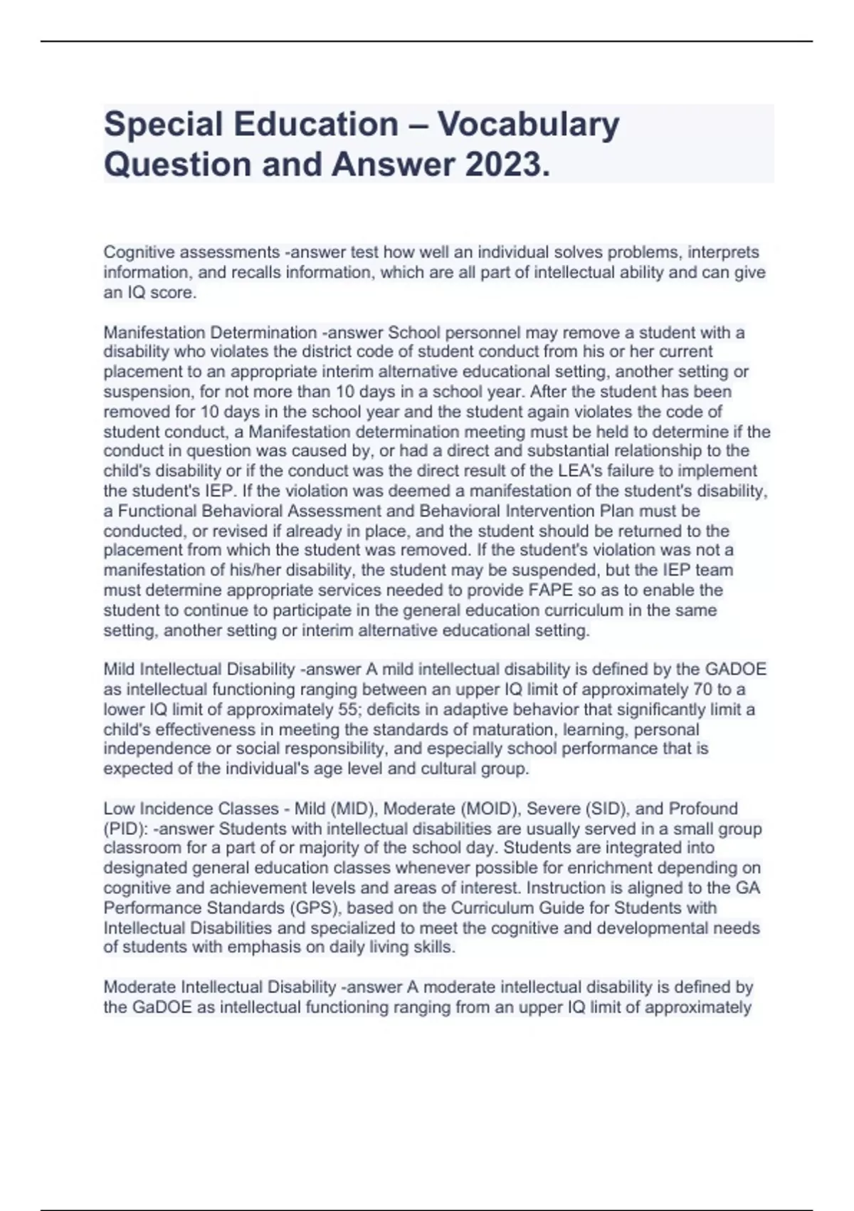 Special Education – Vocabulary Question and Answer 2023. Cognitive assessments -answer test how well an individual solves problems, interprets information, and recalls information, which are all part of intellectual ability and can give an IQ score. Manifestation Determination -answer School personnel may remove a student with a disability who violates the district code of student conduct from his or her current placement to an appropriate interim alternative educational setting, another setting or suspension, for not more than 10 days in a school year. After the student has been removed for 10 days in the school year and the student again violates the code of student conduct, a Manifestation determination meeting must be held to determine if the conduct in question was caused by, or had a direct and substantial relationship to the child's disability or if the conduct was the direct result of the LEA's failure to implement the student's IEP. If the violation was deemed a manifestation of the student's disability, a Functional Behavioral Assessment and Behavioral Intervention Plan must be conducted, or revised if already in place, and the student should be returned to the placement from which the student was removed. If the student's violation was not a manifestation of his/her disability, the student may be suspended, but the IEP team must determine appropriate services needed to provide FAPE so as to enable the student to continue to participate in the general education curriculum in the same setting, another setting or interim alternative educational setting. Mild Intellectual Disability -answer A mild intellectual disability is defined by the GADOE as intellectual functioning ranging between an upper IQ limit of approximately 70 to a lower IQ limit of approximately 55; deficits in adaptive behavior that significantly limit a child's effectiveness in meeting the standards of maturation, learning, personal independence or social responsibility, and especially school performance that is expected of the individual's age level and cultural group. Low Incidence Classes - Mild (MID), Moderate (MOID), Severe (SID), and Profound (PID): -answer Students with intellectual disabilities are usually served in a small group classroom for a part of or majority of the school day. Students are integrated into designated general education classes whenever possible for enrichment depending on cognitive and achievement levels and areas of interest. Instruction is aligned to the GA Performance Standards (GPS), based on the Curriculum Guide for Students with Intellectual Disabilities and specialized to meet the cognitive and developmental needs of students with emphasis on daily living skills. Moderate Intellectual Disability -answer A moderate intellectual disability is defined by the GaDOE as intellectual functioning ranging from an upper IQ limit of approximately