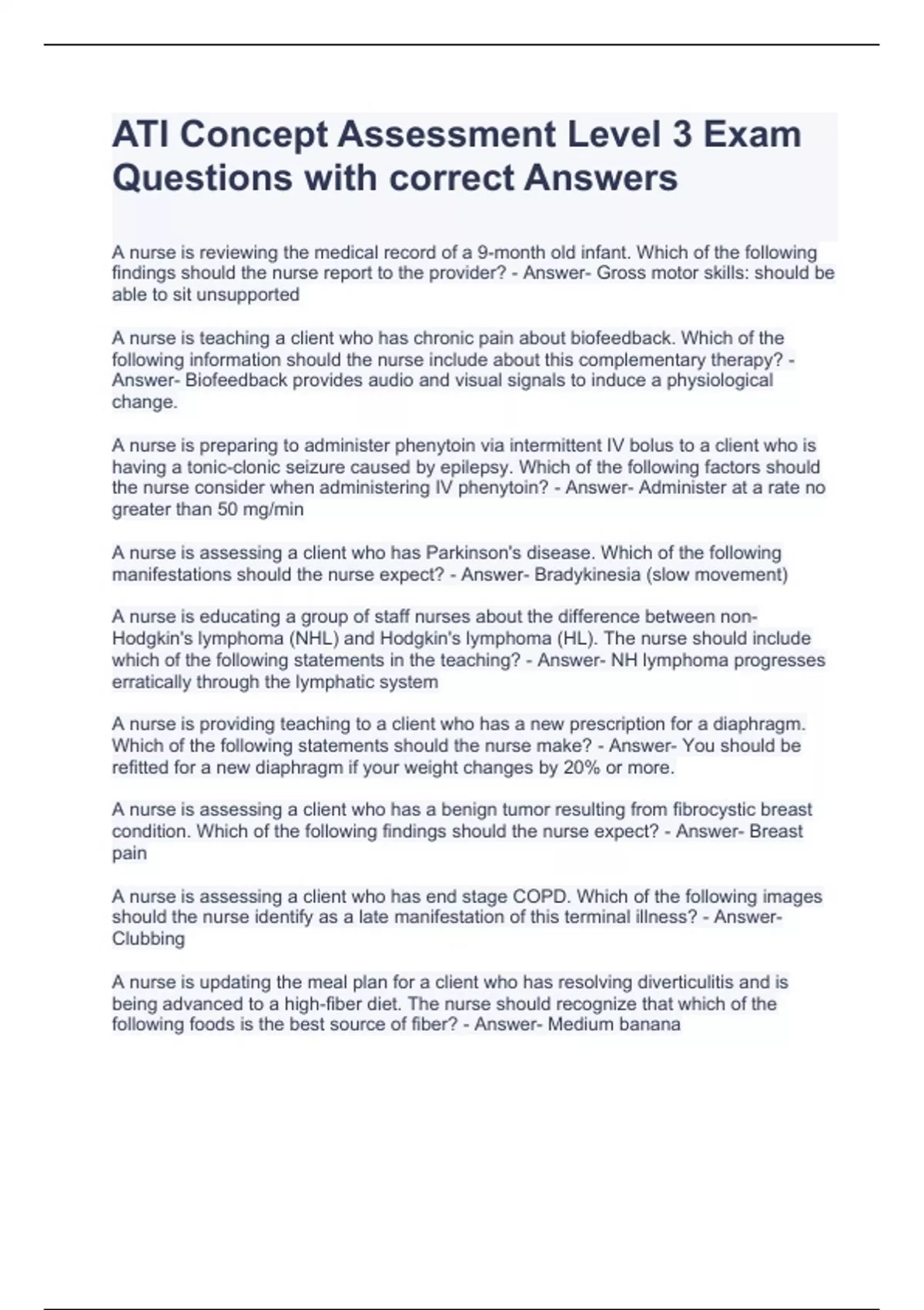 ATI Concept Assessment Level 3 Exam Questions with correct Answers