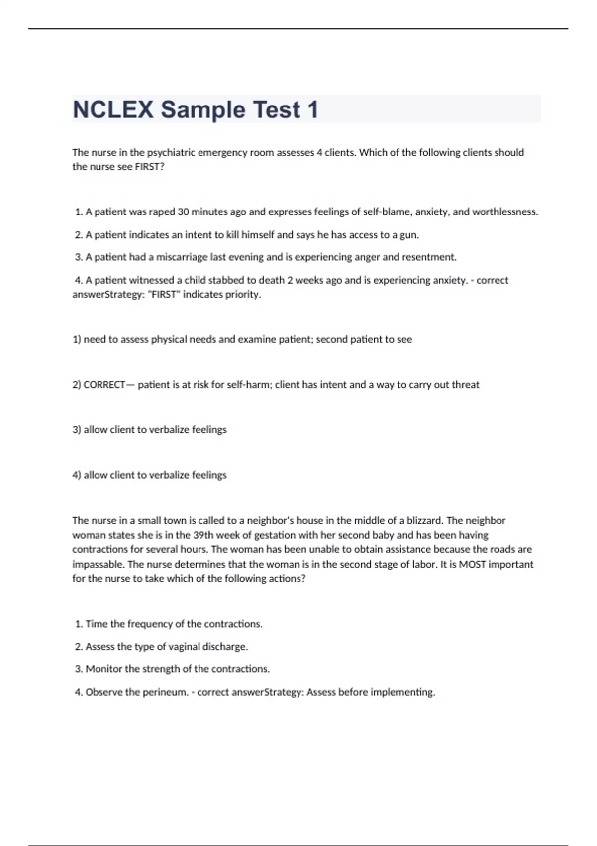 The nurse in the psychiatric emergency room assesses 4 clients. Which of the following clients should the nurse see FIRST? 1. A patient was raped 30 minutes ago and expresses feelings of self-blame, anxiety, and worthlessness. 2. A patient indicates an intent to kill himself and says he has access to a gun. 3. A patient had a miscarriage last evening and is experiencing anger and resentment. 4. A patient witnessed a child stabbed to death 2 weeks ago and is experiencing anxiety. - correct answerStrategy: "FIRST" indicates priority. 1) need to assess physical needs and examine patient; second patient to see 2) CORRECT— patient is at risk for self-harm; client has intent and a way to carry out threat 3) allow client to verbalize feelings 4) allow client to verbalize feelings The nurse in a small town is called to a neighbor's house in the middle of a blizzard. The neighbor woman states she is in the 39th week of gestation with her second baby and has been having contractions for several hours. The woman has been unable to obtain assistance because the roads are impassable. The nurse determines that the woman is in the second stage of labor. It is MOST important for the nurse to take which of the following actions? 1. Time the frequency of the contractions. 2. Assess the type of vaginal discharge. 3. Monitor the strength of the contractions. 4. Observe the perineum. - correct answerStrategy: Assess before implementing.